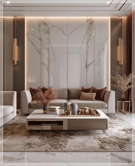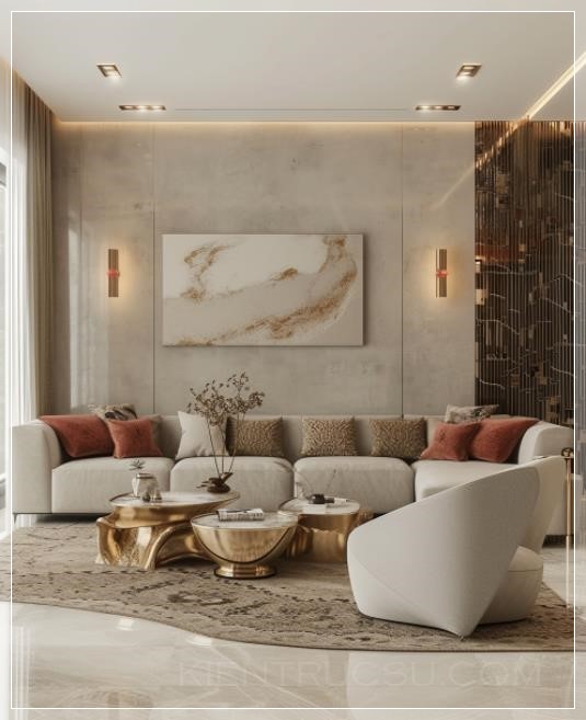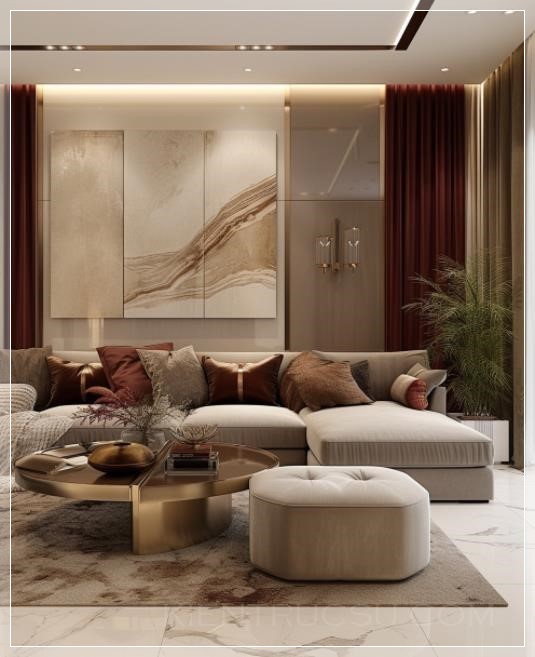 luxury living room design by osama abad, in the style of soft and dreamy tones, light bronze and light beige, polished surfaces, silhouette lighting, linear delicacy, luxurious wall hangings, light gray and light crimson --ar 68:83 --v 6.0 --style raw