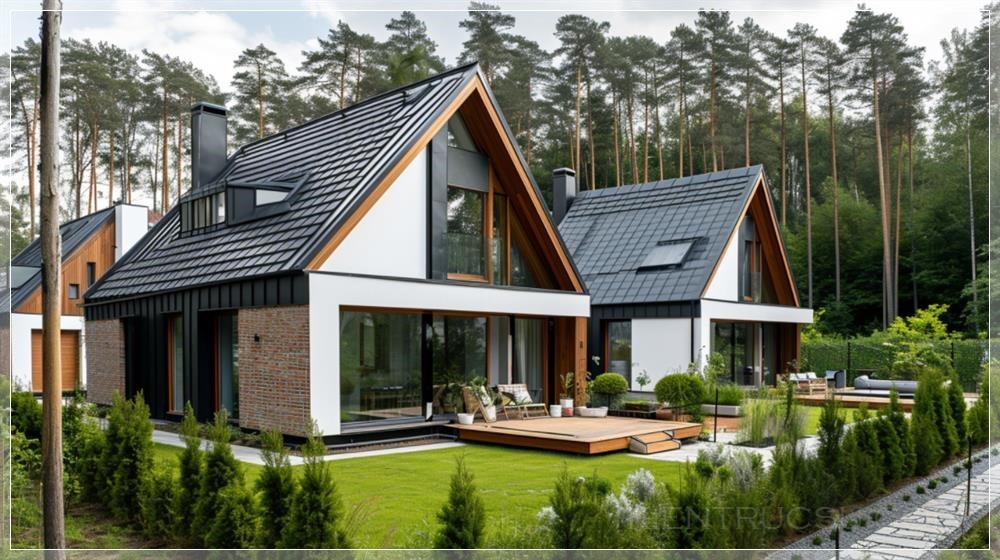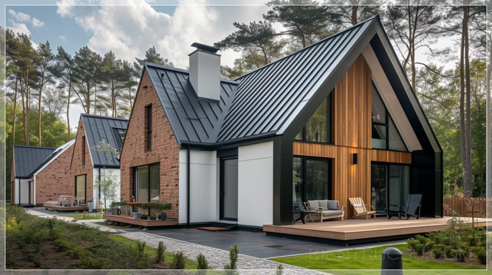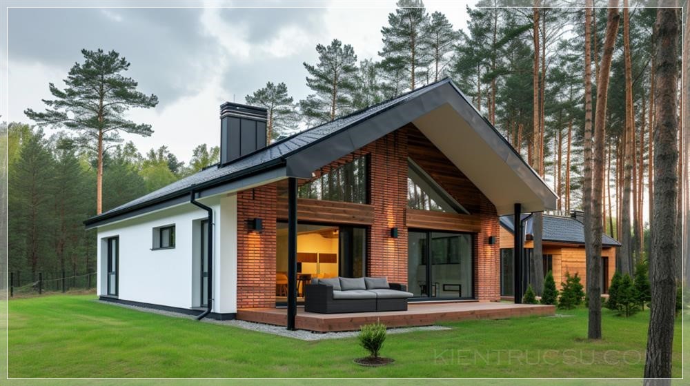 PROMPT: small fragments of premium modern minimalistic, scandinavian, small housing complex, located near a forest, diagonal angle, black roof, white walls, wooden and brick elements --ar 16:9 --style raw --v 6.0 Ý Nghĩa:
