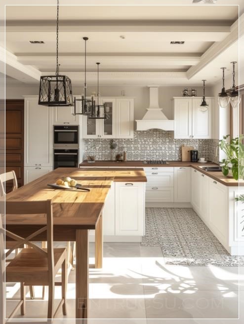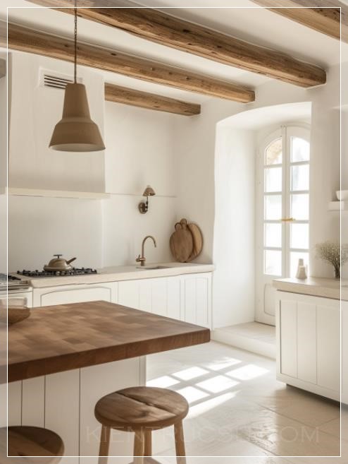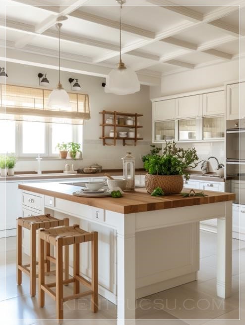 PROMPT: Mediterranean white kitchen with wooden island. Elegant apartment. --style raw --v 6.0 --ar 3:4 Ý Nghĩa: