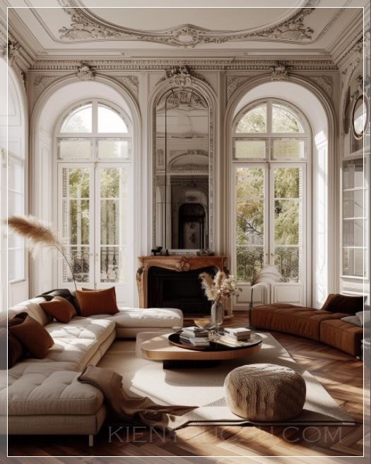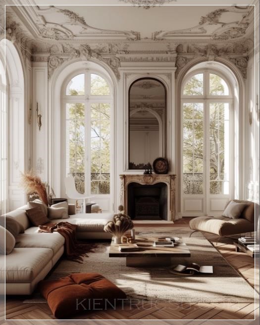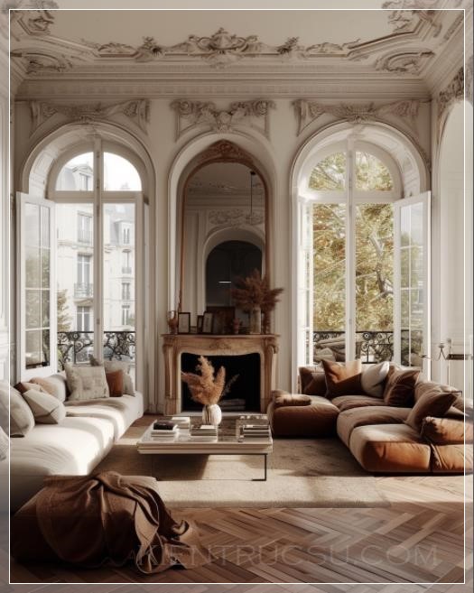a parisian surreal chocolate studio with large arched windows and french doors. furnished with a surreal color scheme. with wide plank herringbone floors, ornate crown molding, and a large fireplace with a mirror above. --ar 4:5 --v 6.0