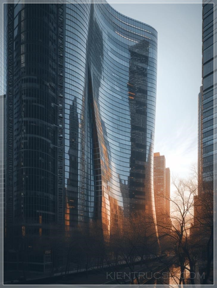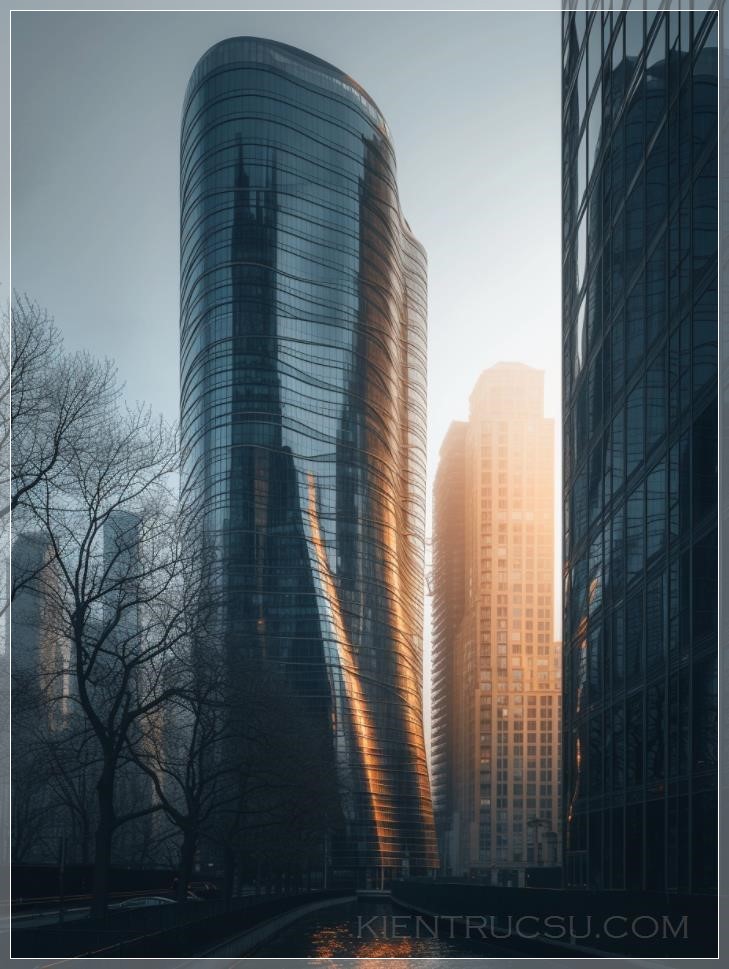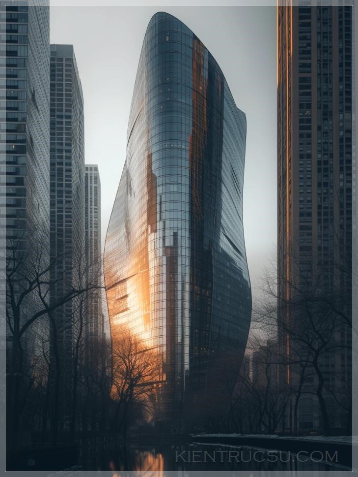 PROMPT: architecture award photo of curved fluid skyscraper, beautiful city park background, dramatic shadows, --ar 3:4 --v 6.0 Ý Nghĩa: