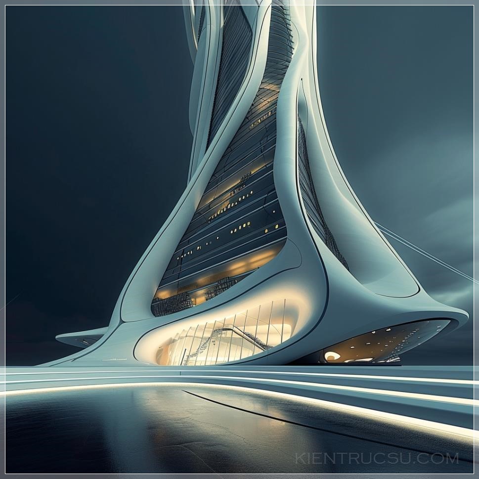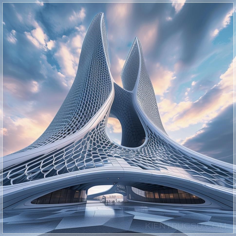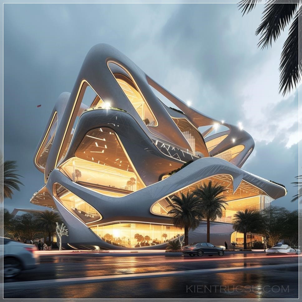 Create an image of a futuristic building that combines architectural influences from Rem Koolhaas, Renzo Piano, Norman Foster, and Zaha Hadid. Think of striking geometric forms, innovative use of materials, and a bold aesthetic that transcends traditional architecture. Draw inspiration from the distinctive styles of these prominent architects and let your imagination run wild --v 6.0