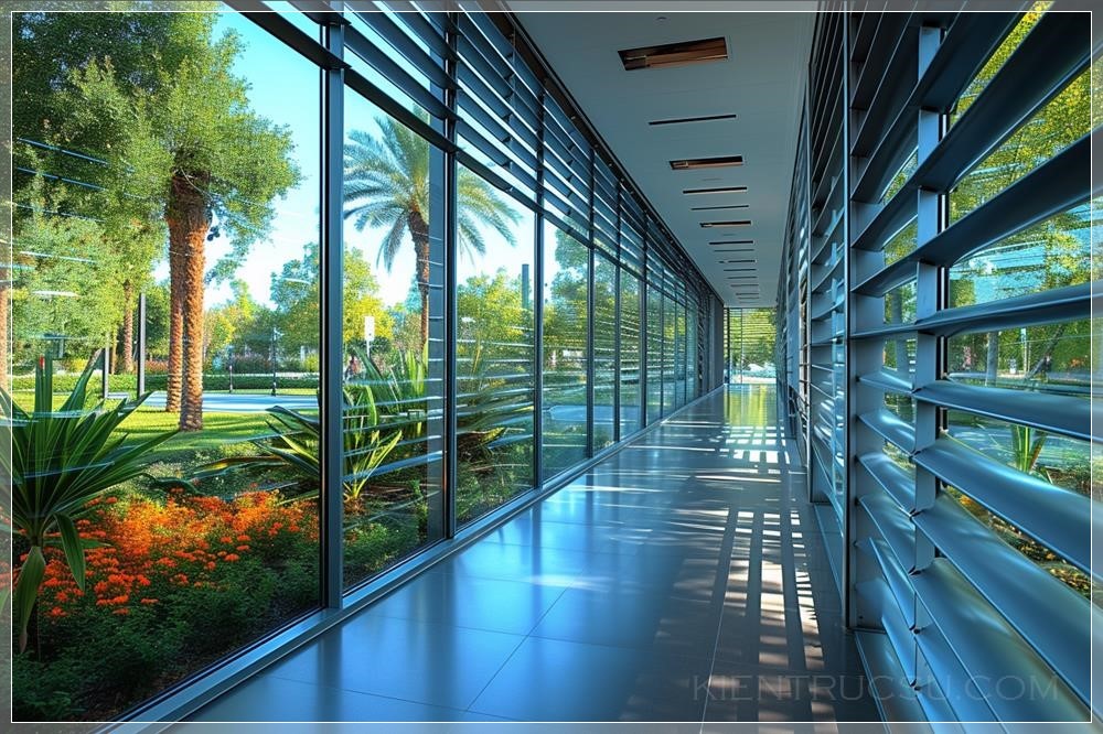 PROMPT: Architectural design with glass jalousie windows, minimalist, advanced, artistic, realistic, ultra-clear --v 6.0 --ar 3:2 --stylize 1000 Ý Nghĩa: