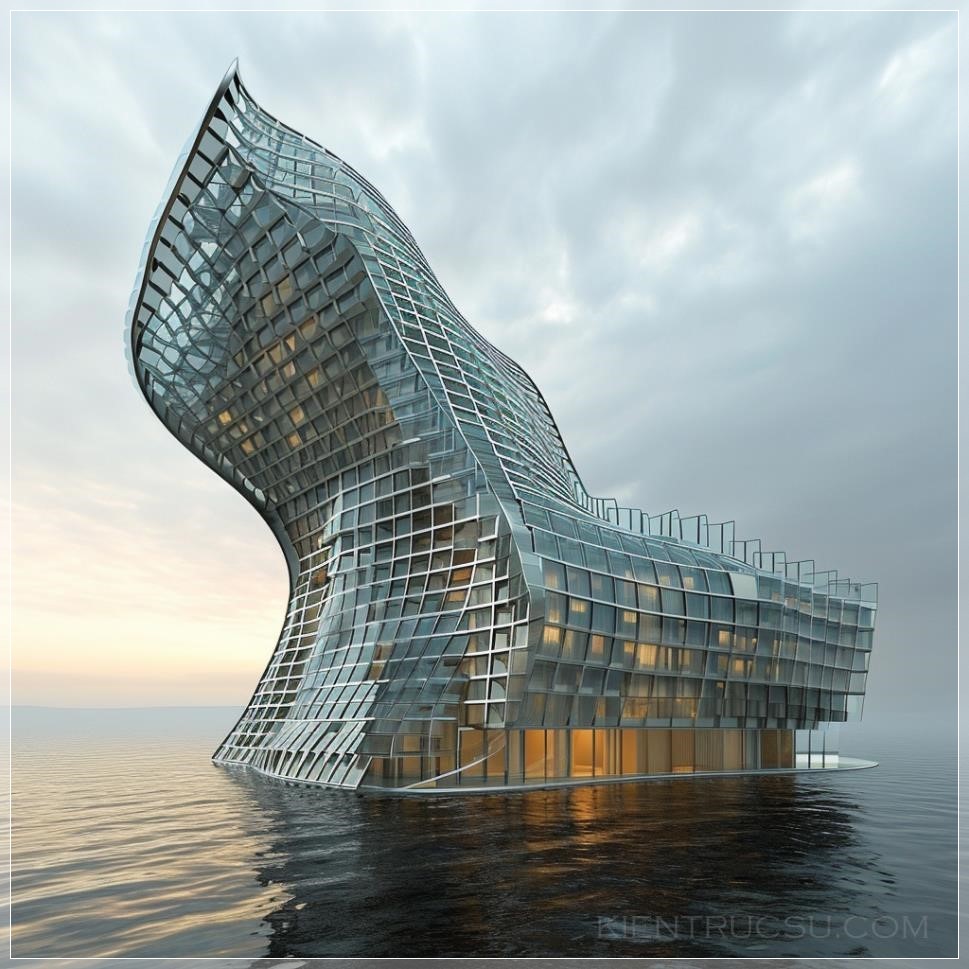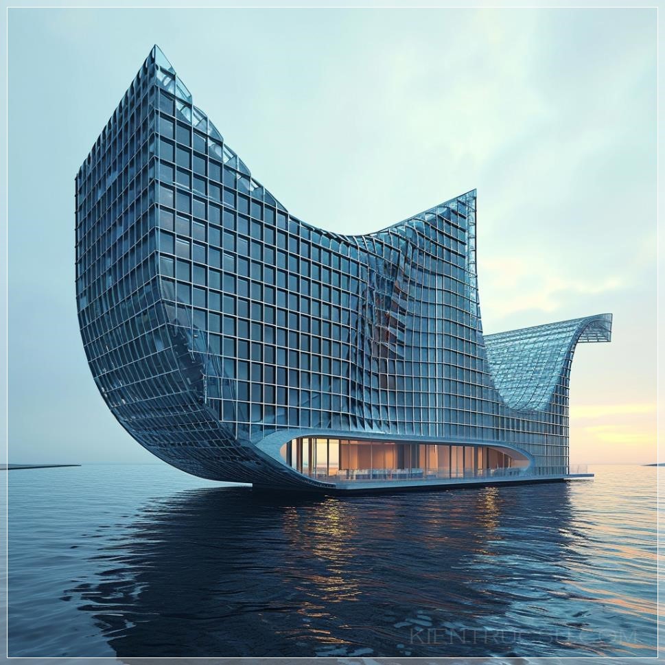 PROMPT: a building which stands on the water, has a form of a wave, build out of large amount of small glass blocks, futuristic style --v 6.0 Ý Nghĩa: