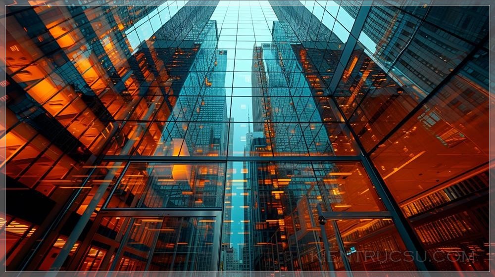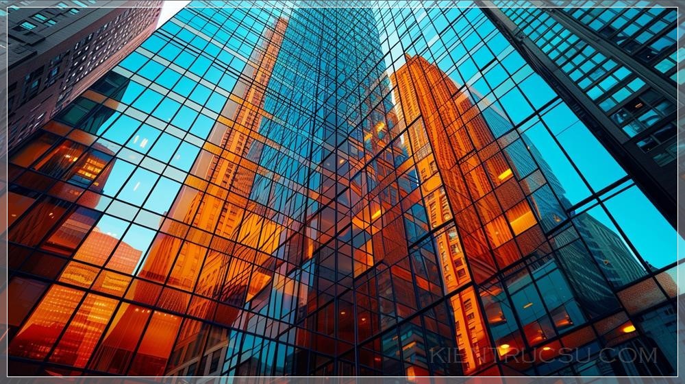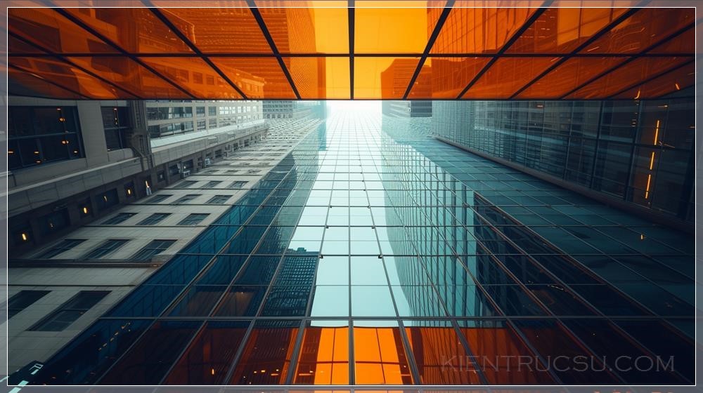 PROMPT: a building in the financial district, reflecting off the glass you can see skyscrapers, with even spaces on each side orange highlights --v 6.0 --ar 16:9 Ý Nghĩa: