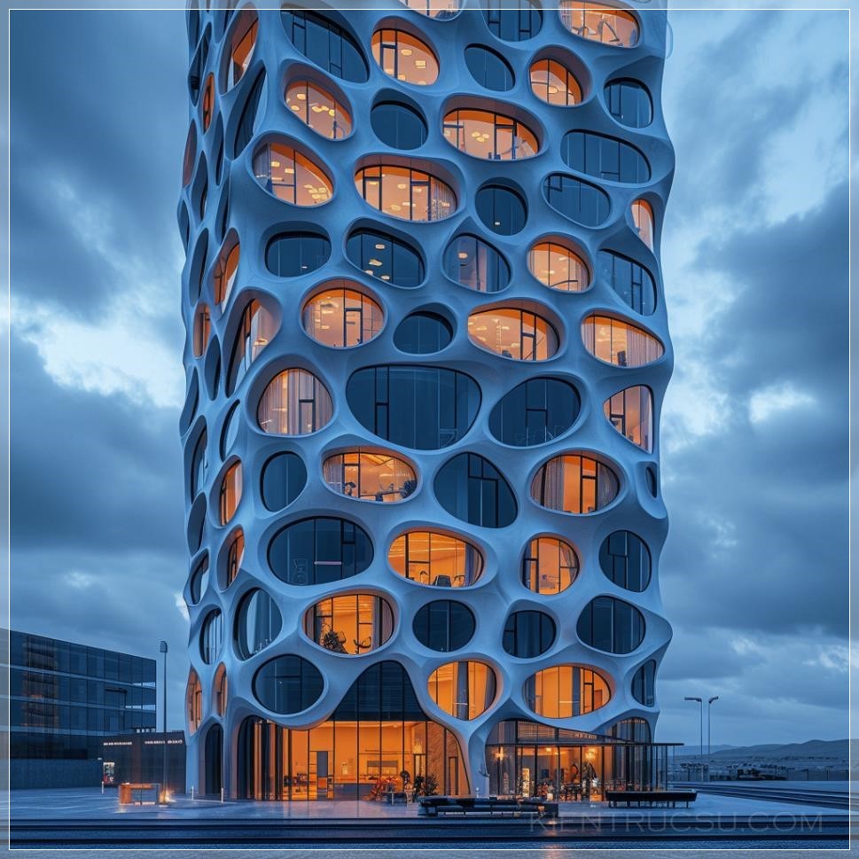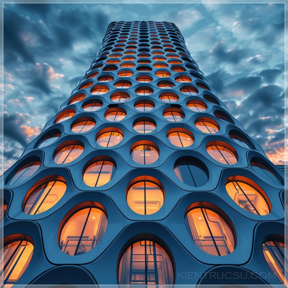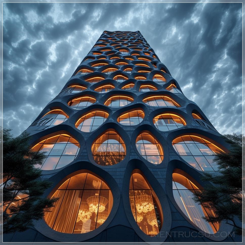 PROMPT: 50 story modern office building.Voronoi parametric facade. Pro photography. Dusk cloudy sky --s 250 --v 6.0 Ý Nghĩa: