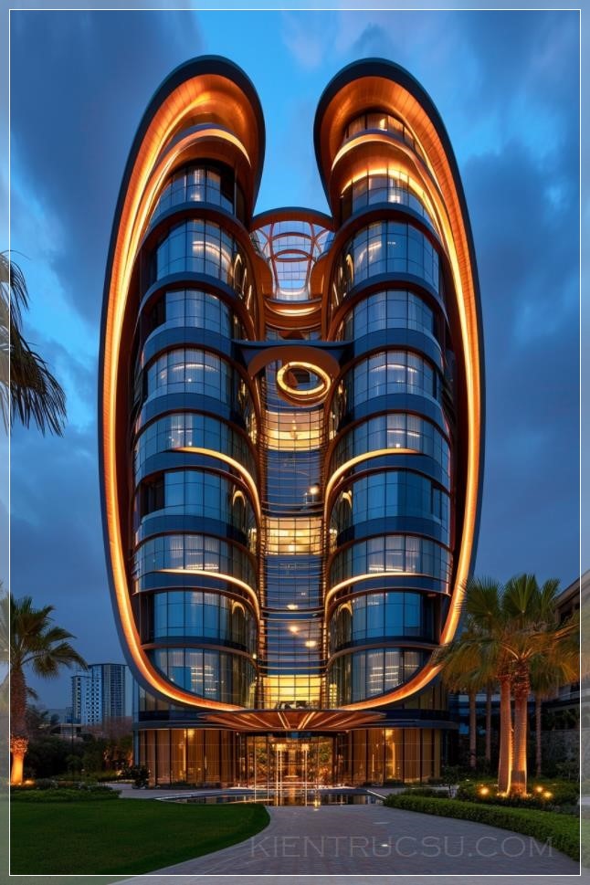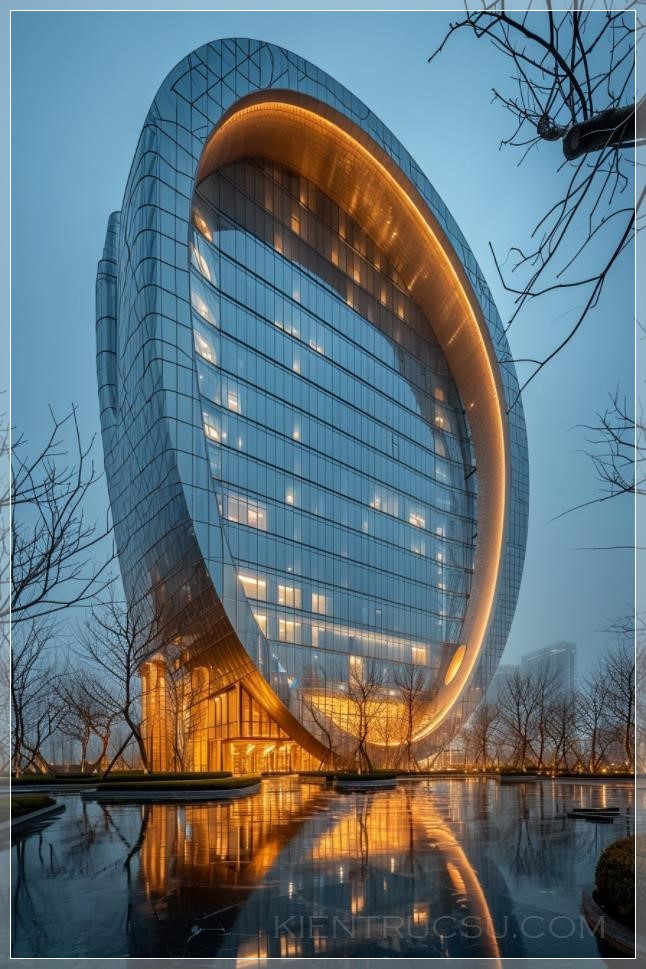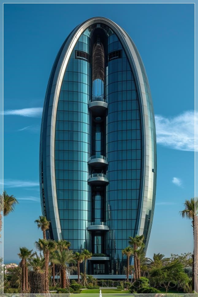 Imagine a grand 5-story hotel, an architectural marvel shaped like two semi-circles embracing a central circular structure at its heart, The entire facade is an awe-inspiring combination of glass and metal, creating a stunning visual spectacle. Picture this unique building, with its sleek and modern design, standing tall and majestic, Craft a narrative that captures the elegance and innovation of this hotel, emphasizing the seamless integration of glass and metal in its outer skin, making it a beacon of sophistication in the cityscape --ar 6:9 --v 6.0 --s 250 --style raw
