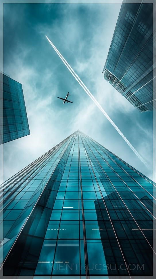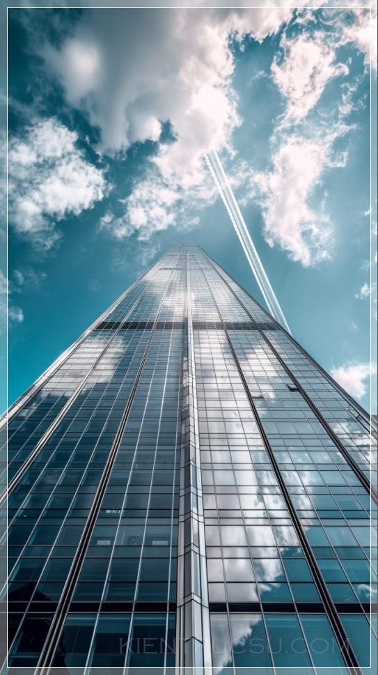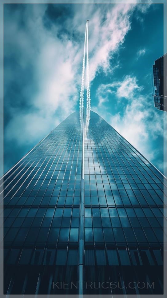 An amazing photo of a skyscraper that seems to touch the sky. The building is made of glass and steel and has a very modern design. A contrail from an airplane flying high above the building adds a dynamic element to the photo. --ar 9:16 --v 6.0