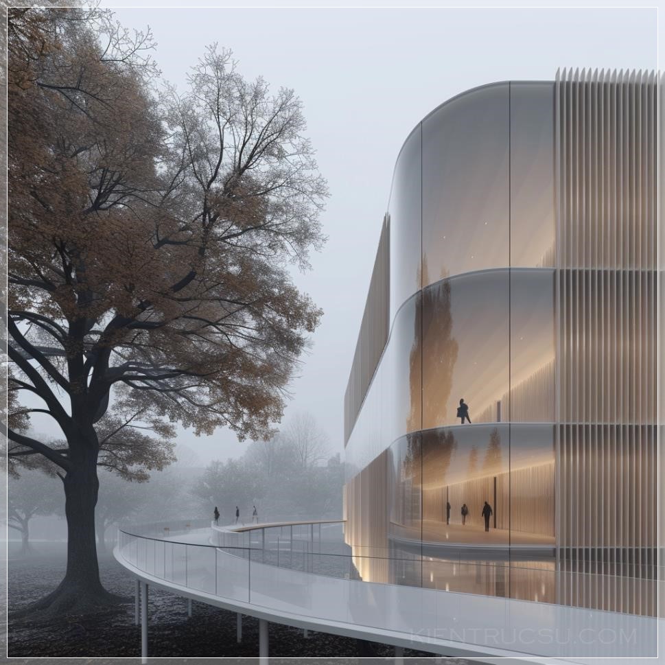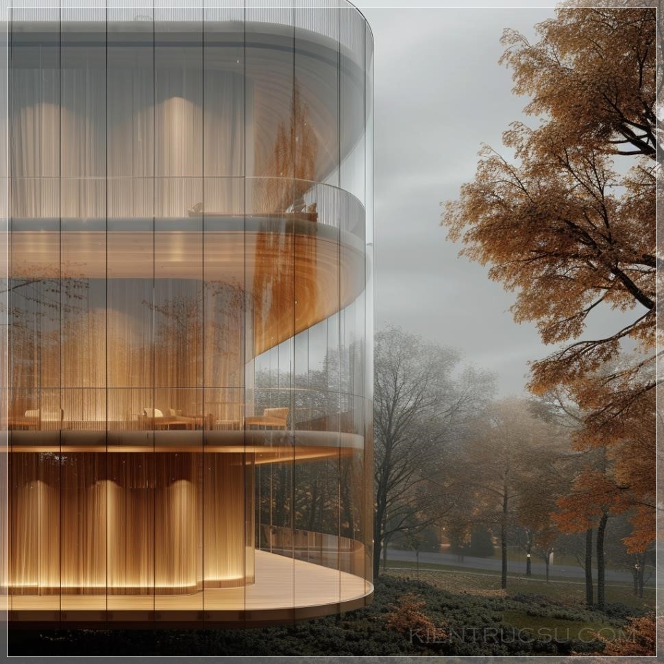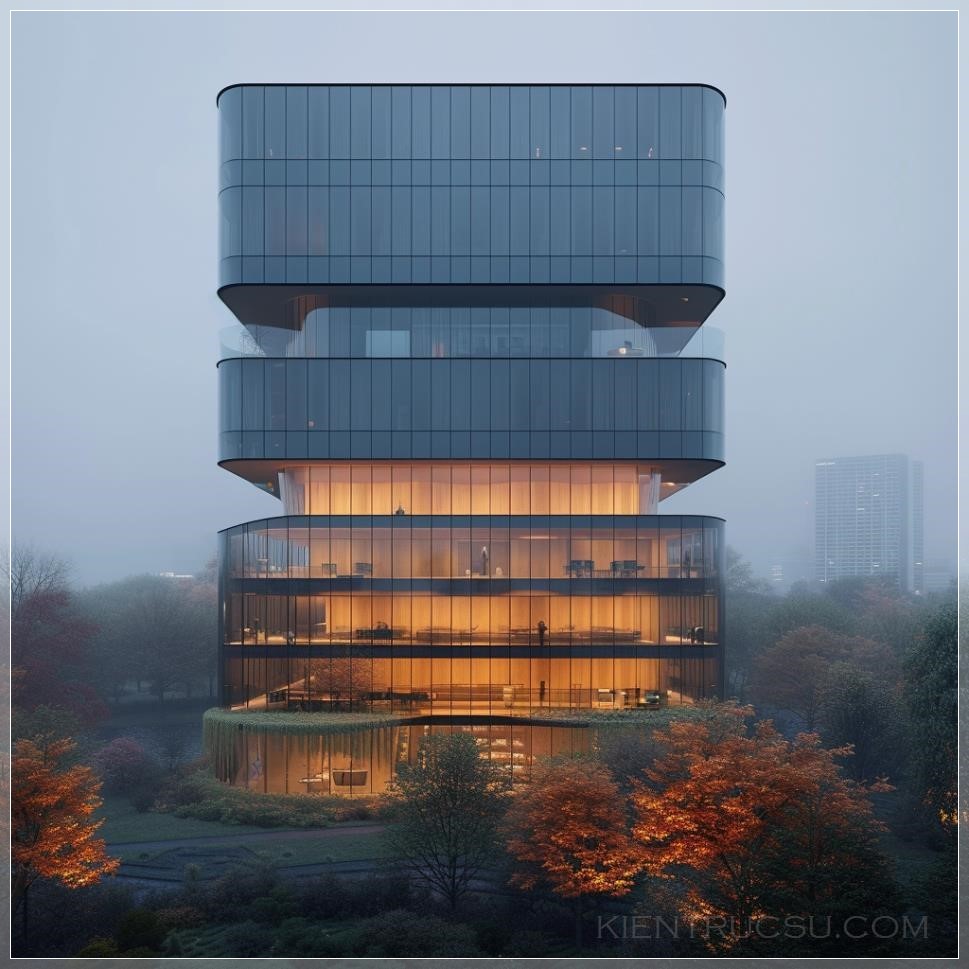 PROMPT: elevation view of floating monolithic building with inverse curved glass facade, light wood vertical cladding, overlooking a park in Berlin, misty, with muted colors, illuminated internally --v 6.0 Ý Nghĩa: