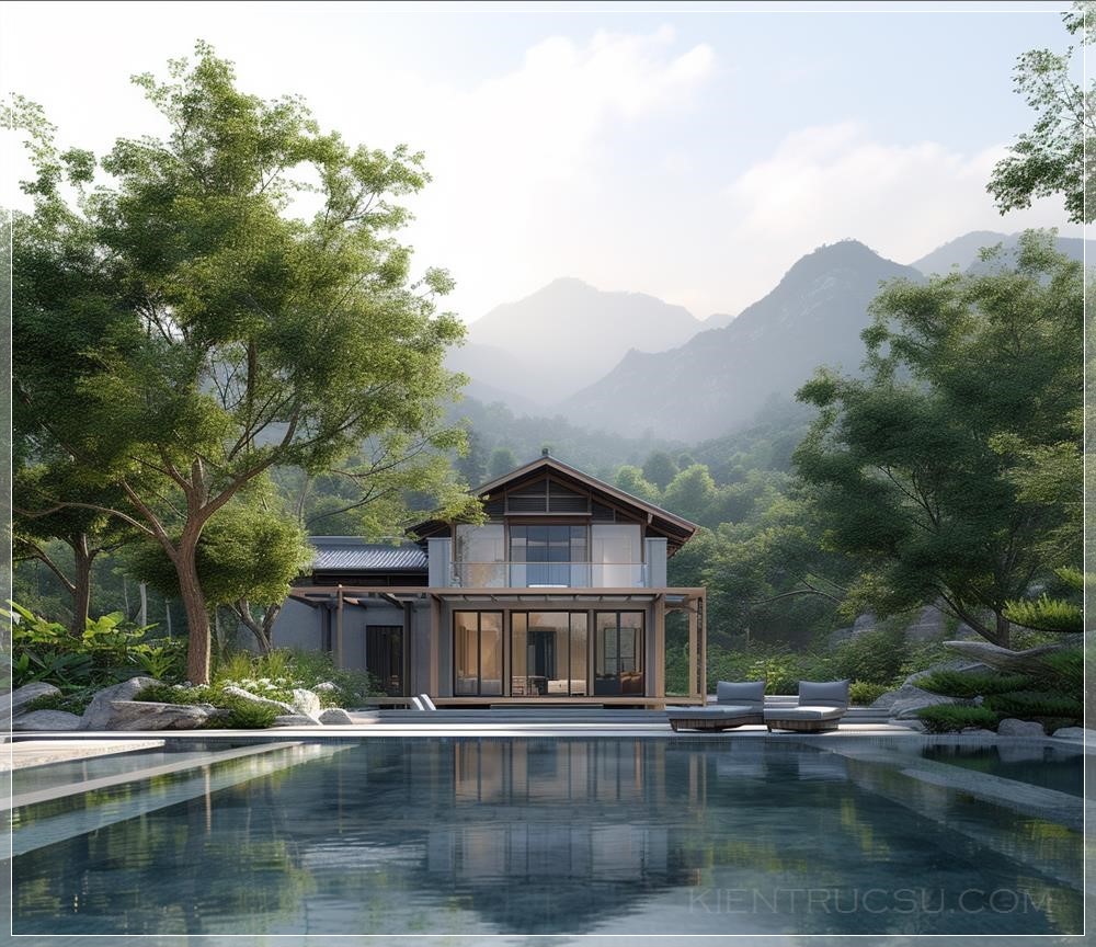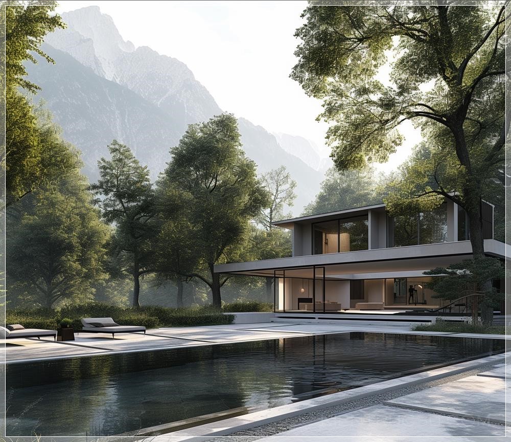 a monochromatic house sits beside a pool surrounded by trees, in the style of rendered in cinema4d, rural china, symmetrical design, mountainous vistas, dark white and bronze, rustic simplicity, design/architecture study --ar 64:55 --v 6.0