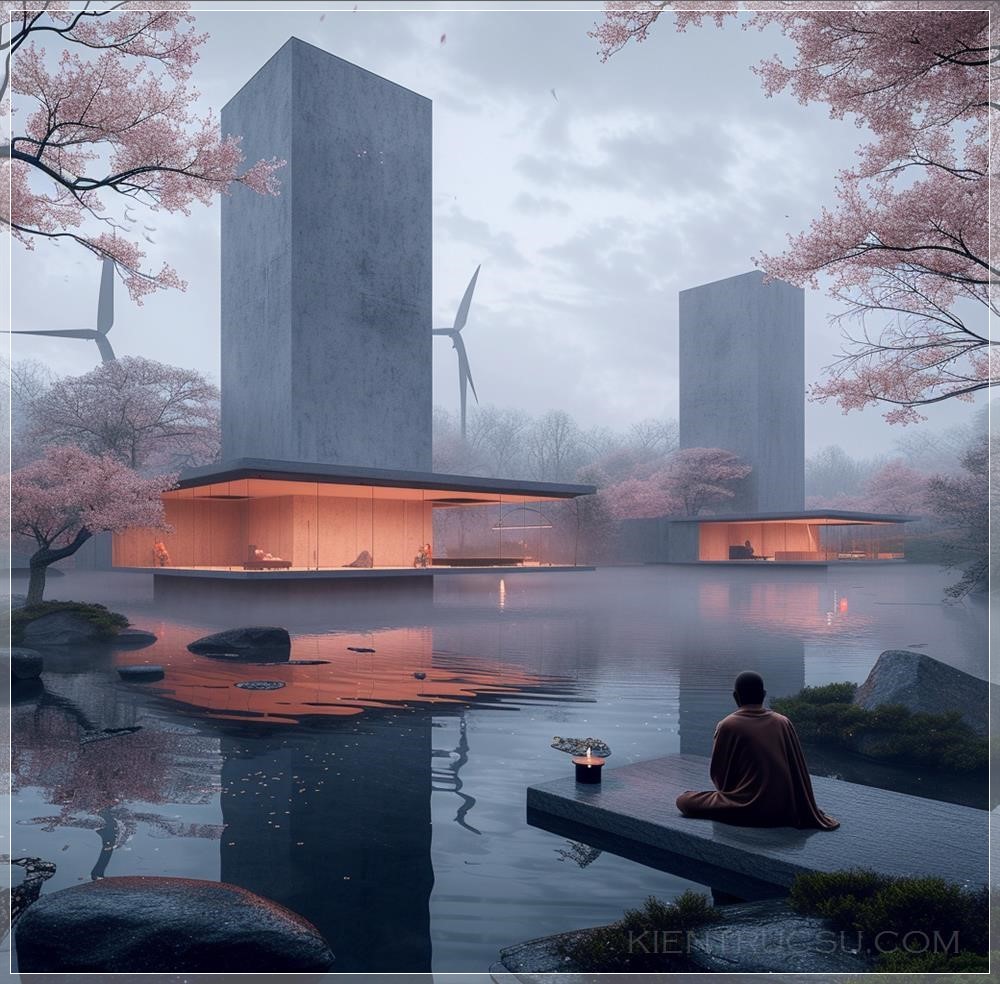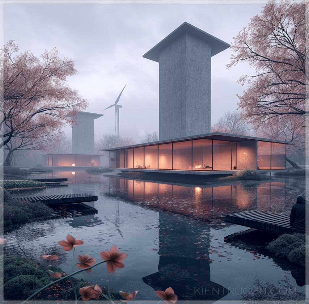 a man looking out at a lake with a wind tower, and other buildings in front of him, in the style of concrete brutalism, rural china, photography installations, perspective rendering, cabincore, cherry blossoms, subversive public installations --ar 128:127 --s 750 --v 6.0 --w 400
