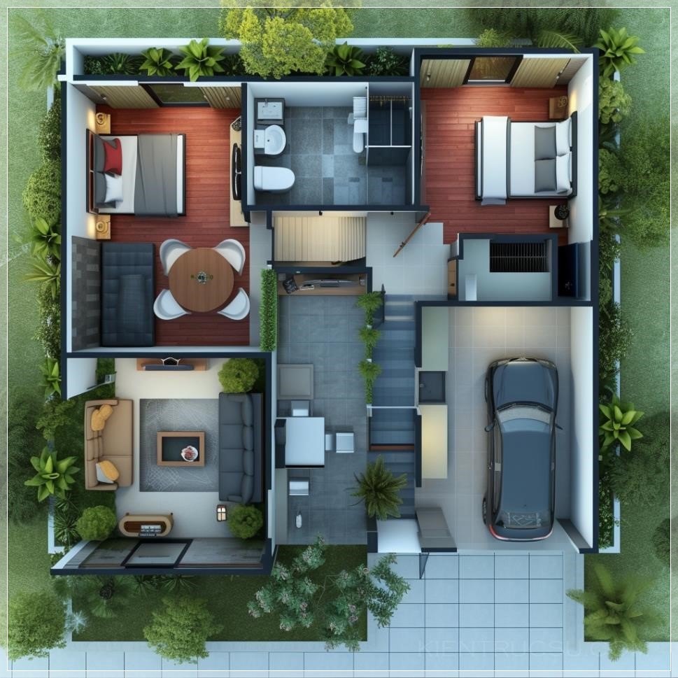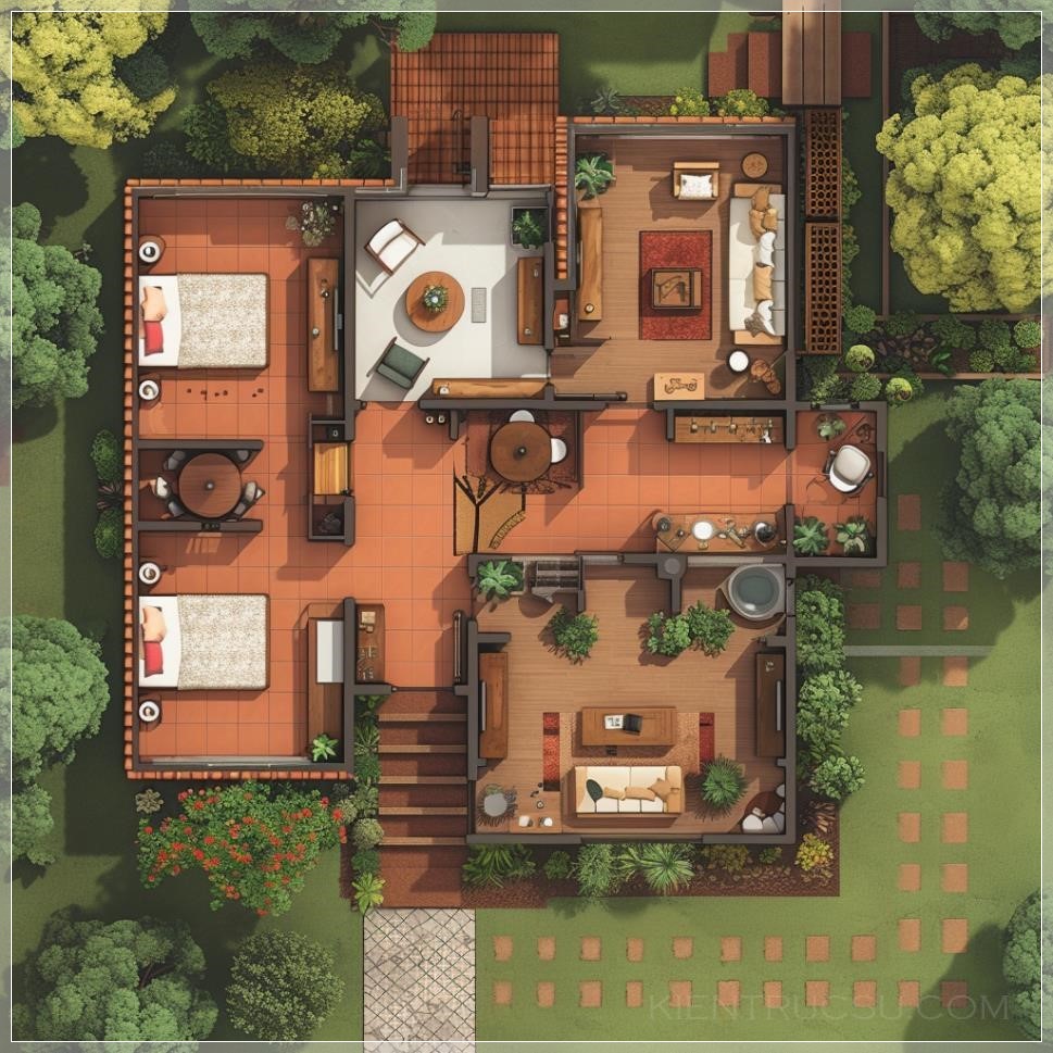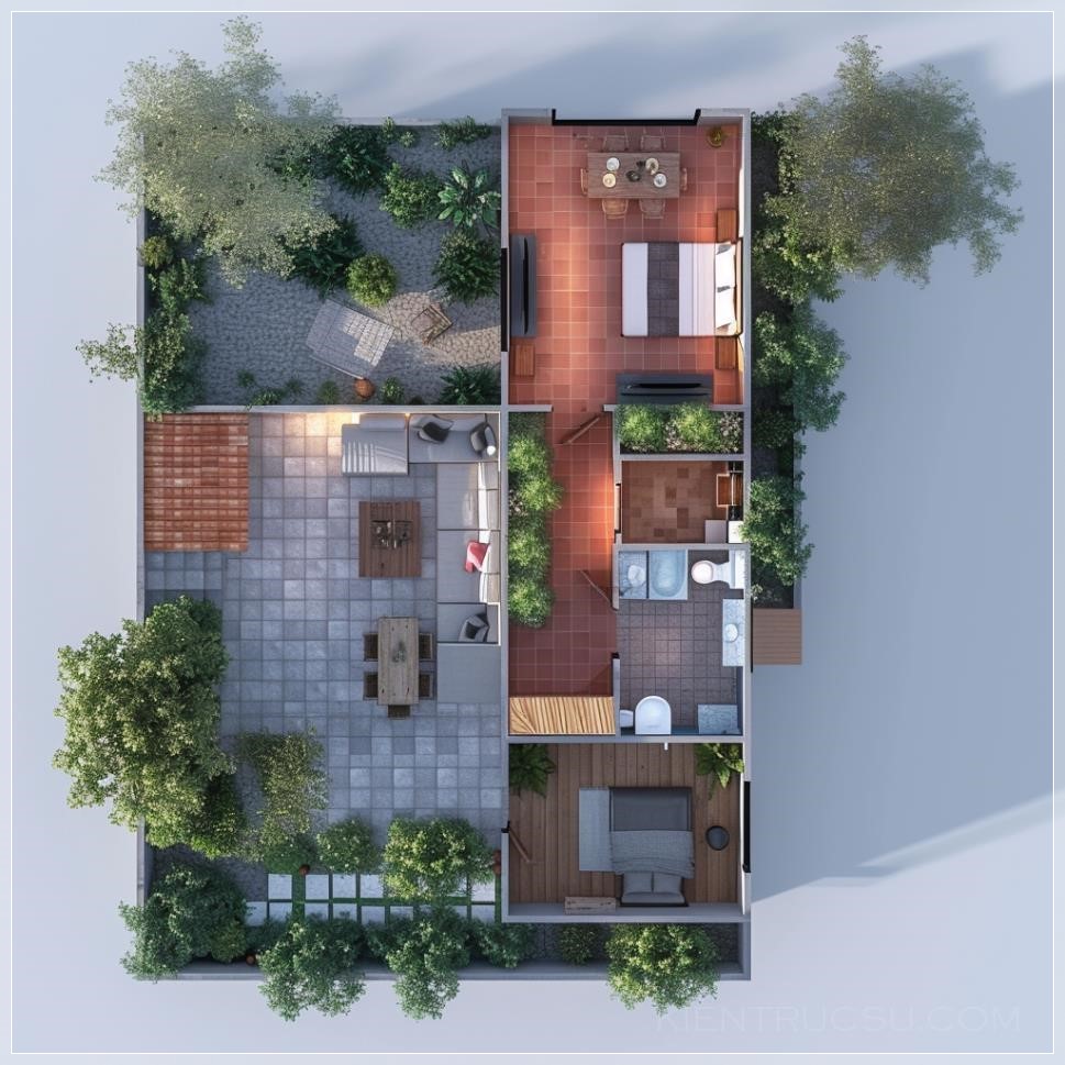 PROMPT: the overview simple house, one floor, red tiles, three rooms, 16m by 4 m --v 6.0 Ý Nghĩa: