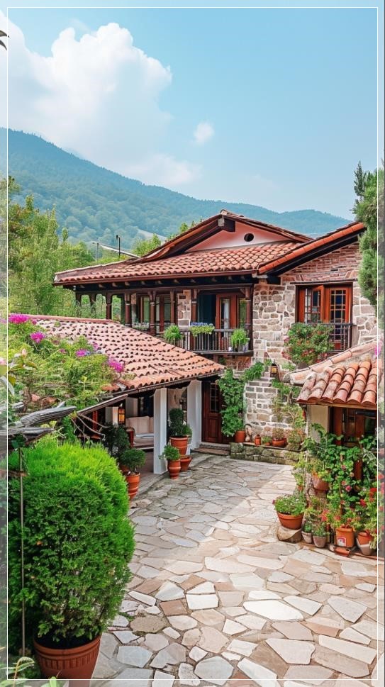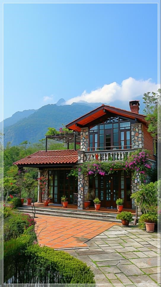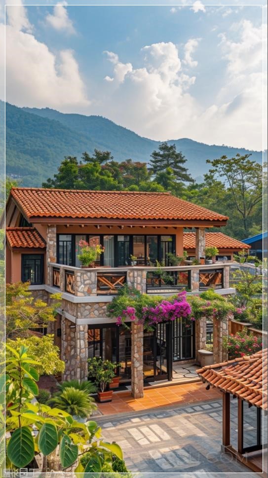 rural two-story luxury villa, sunny, the background is the mountain, red tiles, herringbone roof, the second floor has a large terrace, flowers and plants, the first floor of the cultural stone wall structure, middle view, the house is the main body of photography, the whole building appears in the middle of the picture, the foreground yard is very large, there are potted plants, potted plants with flowers, the yard is very clean and tidy, irregular floor tiles, slr camera telephoto shooting, medium shot, ultra-wide angle, using standard focal length segmented lens, high definition, ultra-high definition, ultra-real, real shot, panoramic bird's eye shot --ar 9:16 --v 6.0