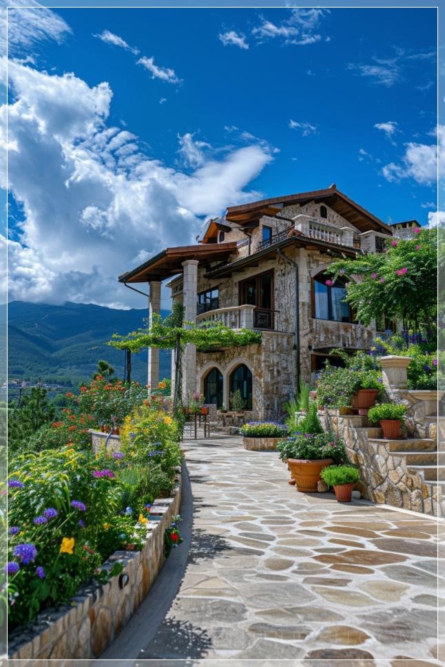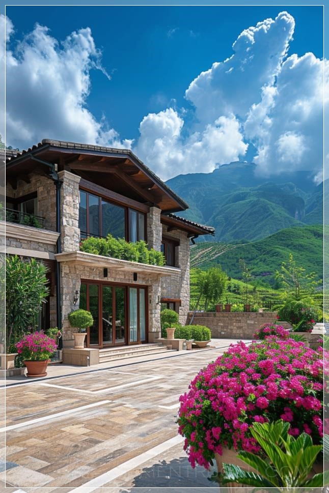 a luxury single-family villa at the foot of the mountain, panoramic angle, blue sky and white clouds, the exterior wall of the villa is brown cultural stone, the roadside is full of beautiful flowers, potted plants, the mountains behind the villa, the mountains are green woods, panoramic villa, super high definition --ar 2:3 --v 6.0