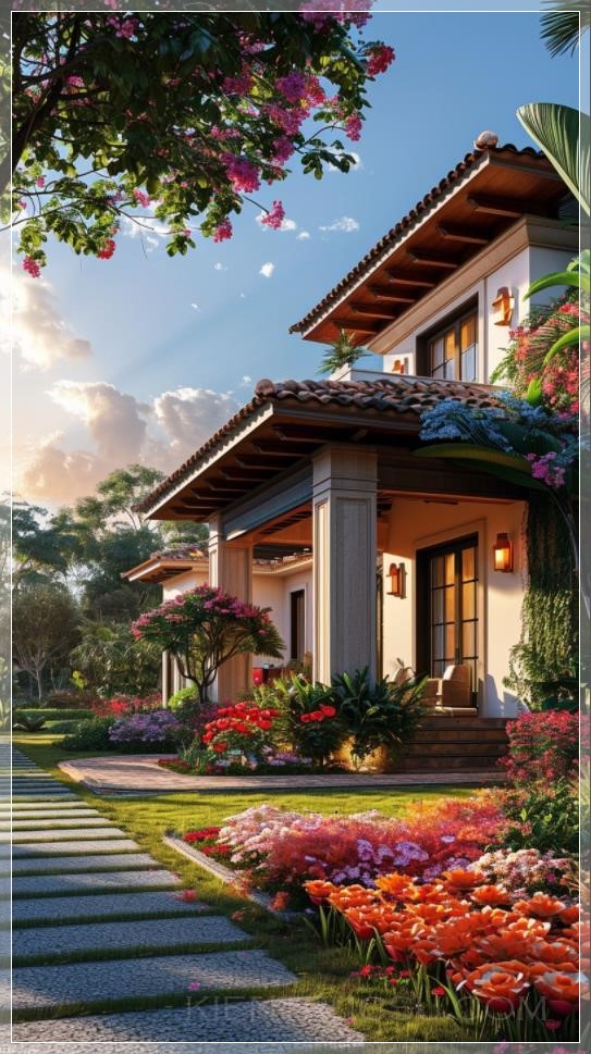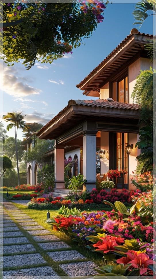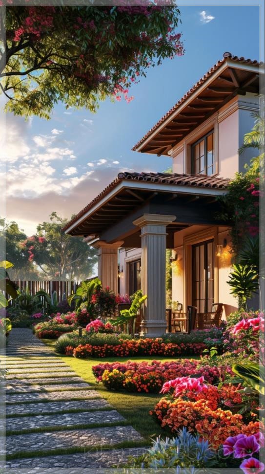 Brazilian architecture, single-story house with pastel colors, facade adorned with artistic details, lush garden featuring vibrant flowers, focus on the main entrance and its unique characteristics, render hyperrealistc, --ar 9:16 --s 250 --v 6.0 --style raw