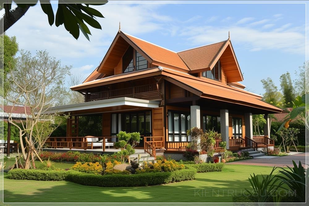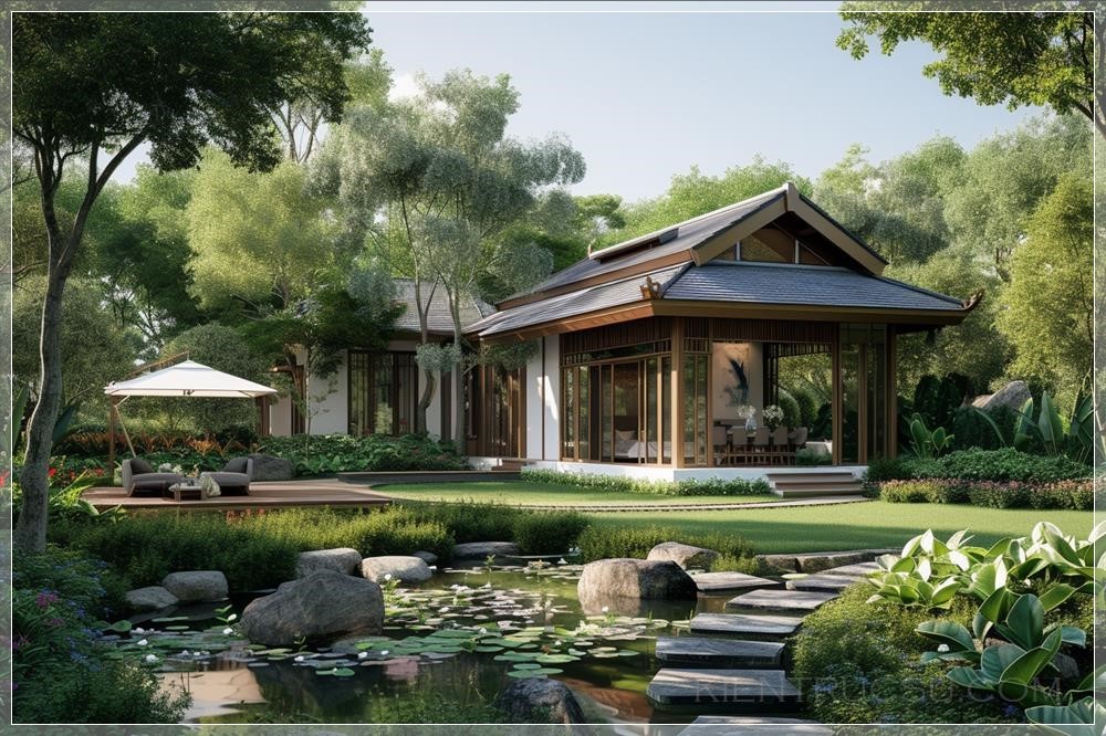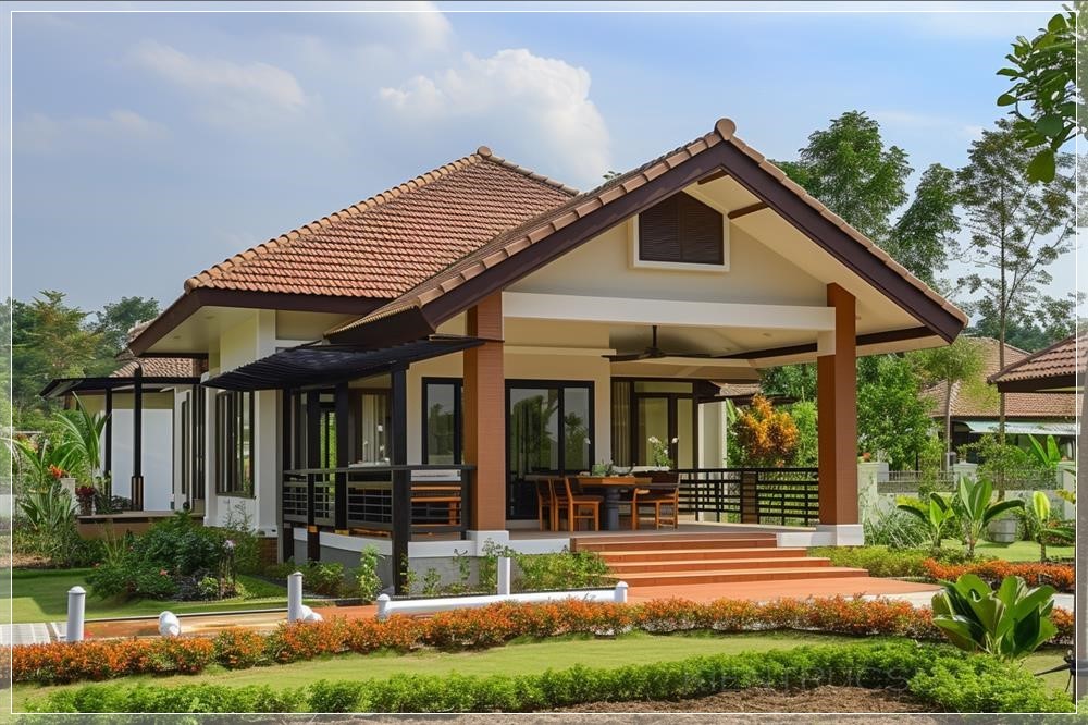 a Thailand-style architectural design with sloping roofs or traditional eaves,agriculture garden, incorporating modern elements, aluminum alloy partitions, set in a tranquil environment, offering options for single or double-story structures. --ar 3:2 --v 6.0