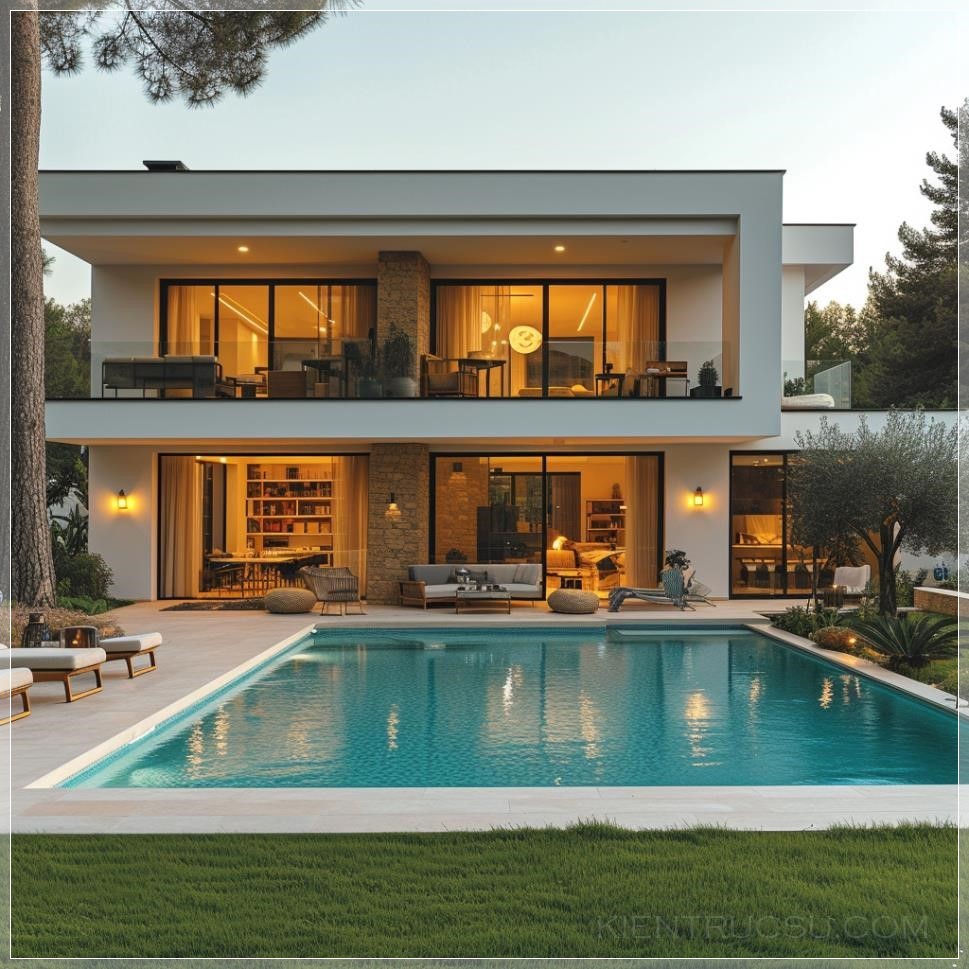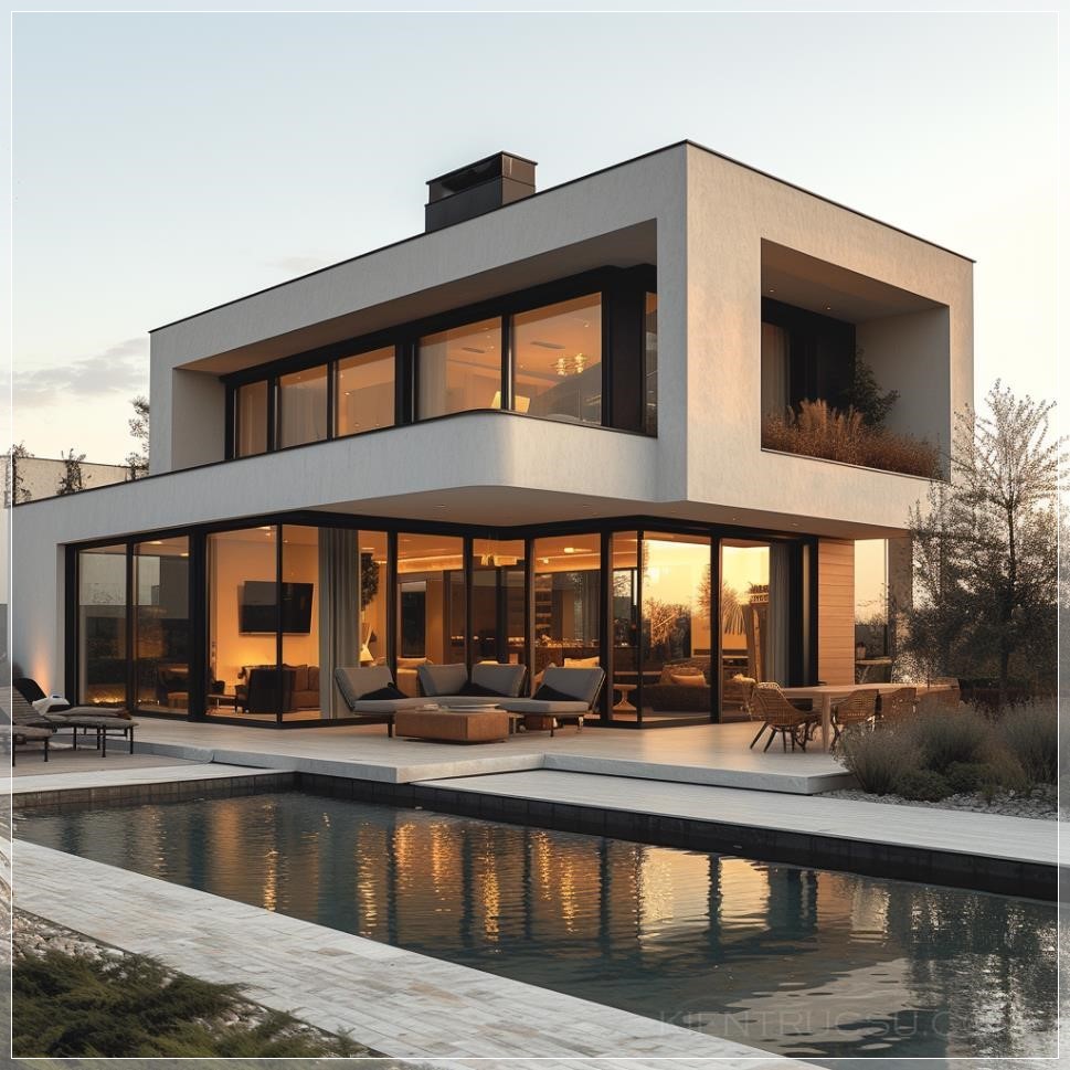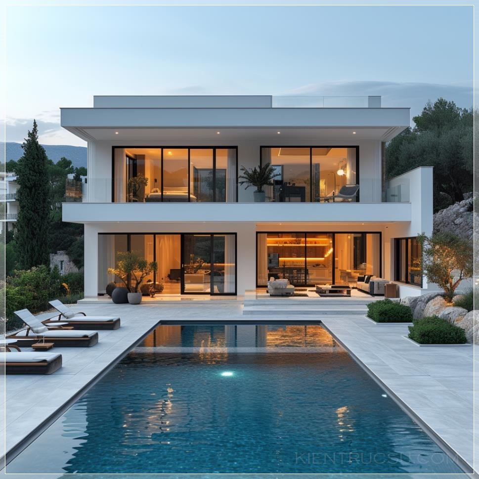 PROMPT: modern house white square with pool in background looking into back of house --v 6.0 --s 750 Ý Nghĩa: