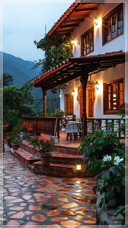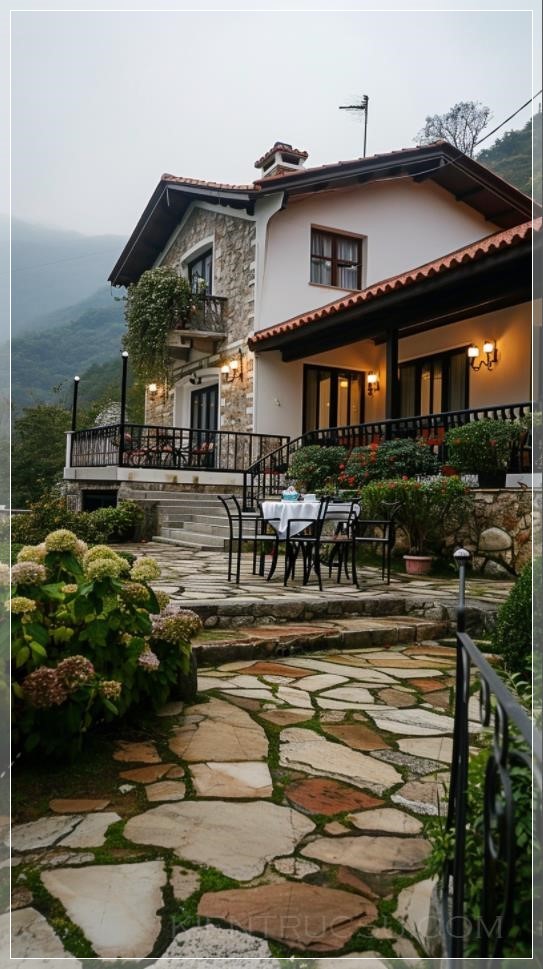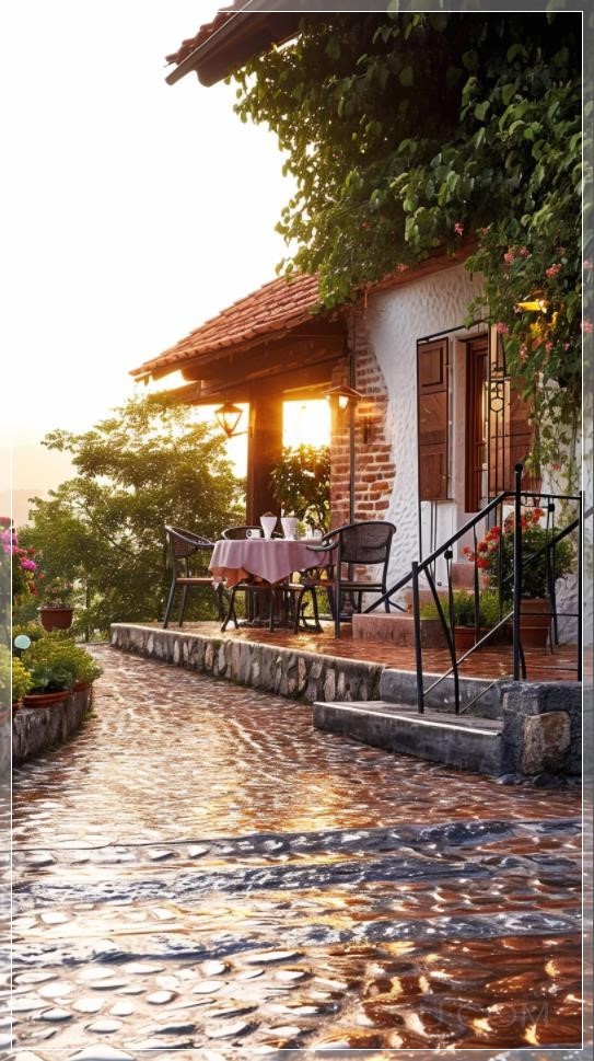mountain village, brick-concrete structure of the country style of a small villa, front view of the house, lights, white walls, red tiles, steps, handrails, railings, wet and delicate large area of bluestone pavement, table chairs tea set, noon warm sun, close-up, garden flowers, ultra-high definition, ultra-wide angle, telephoto lens shooting --ar 9:16 --v 6.0