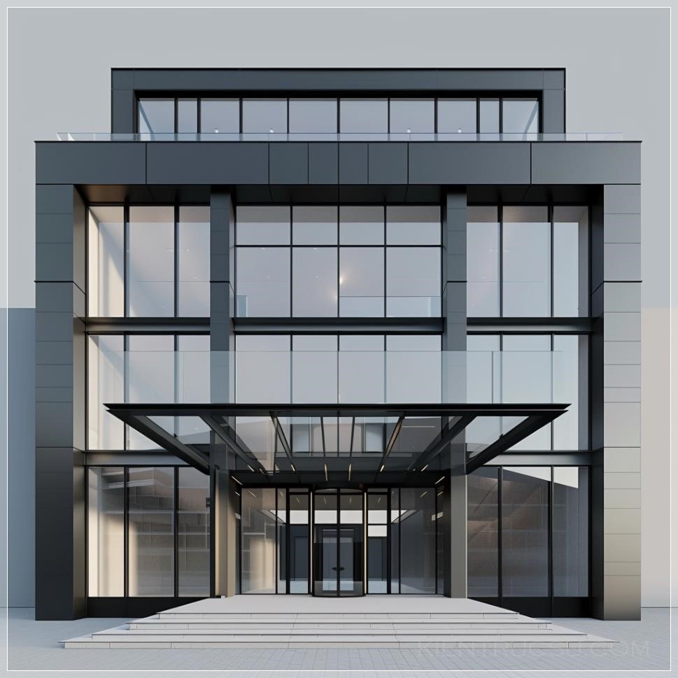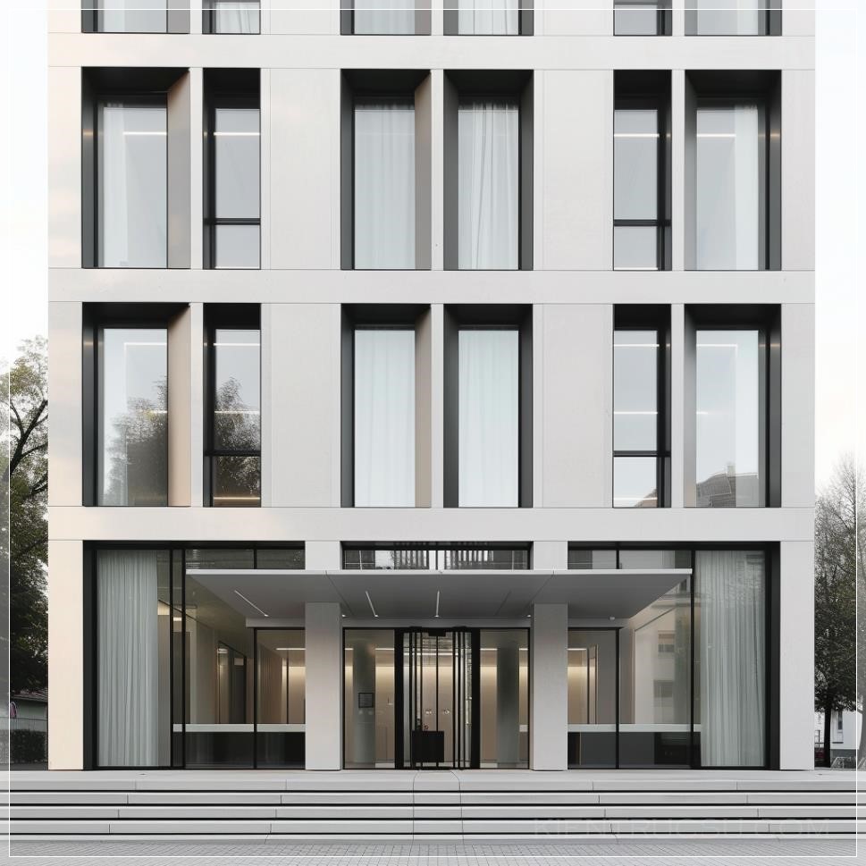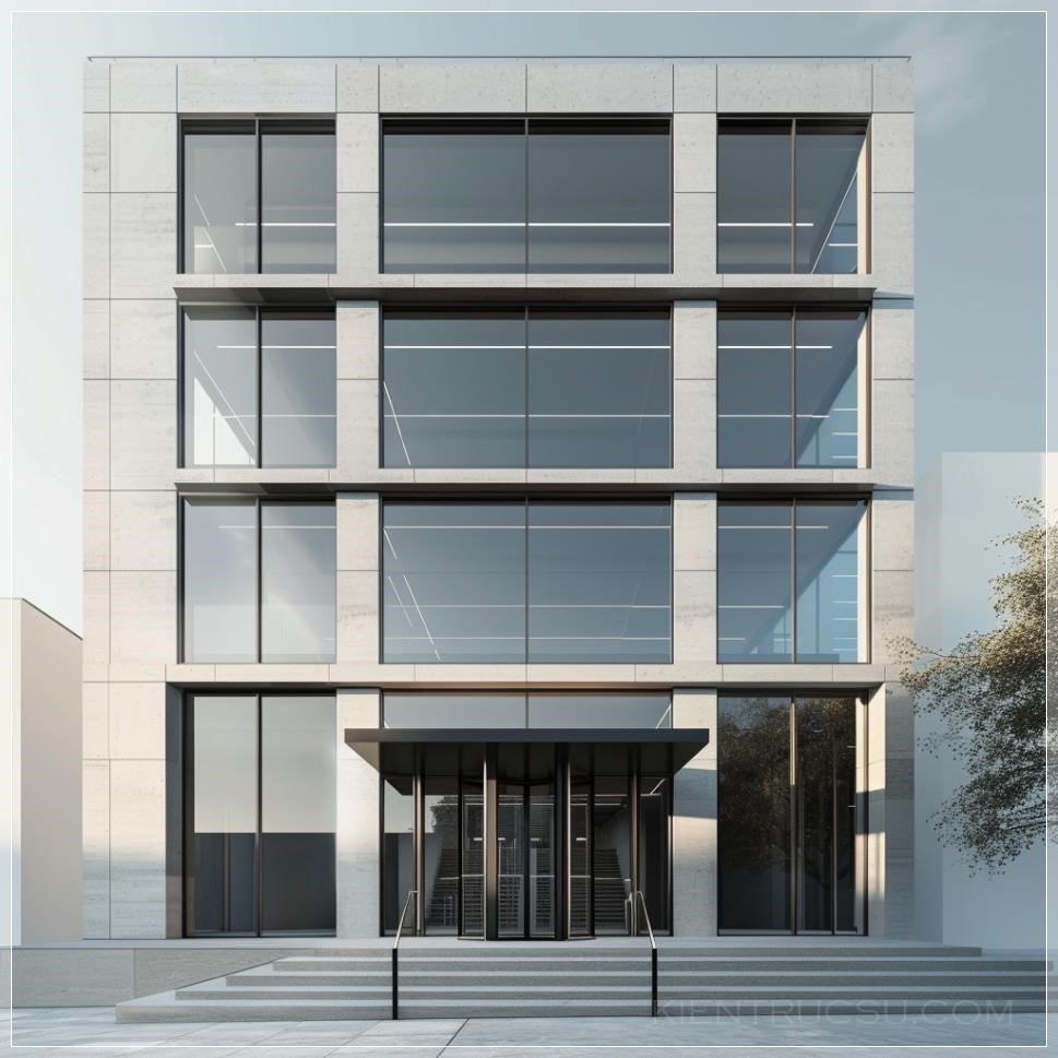 PROMPT: Modern minimalist facade of the building. The facade consists of 4 floors with ribbon glazing, centered on the first floor with a canopy over the entrance and steps leading to the doors. ==ar 16:9 --v 6.0 --s 50 Ý Nghĩa: