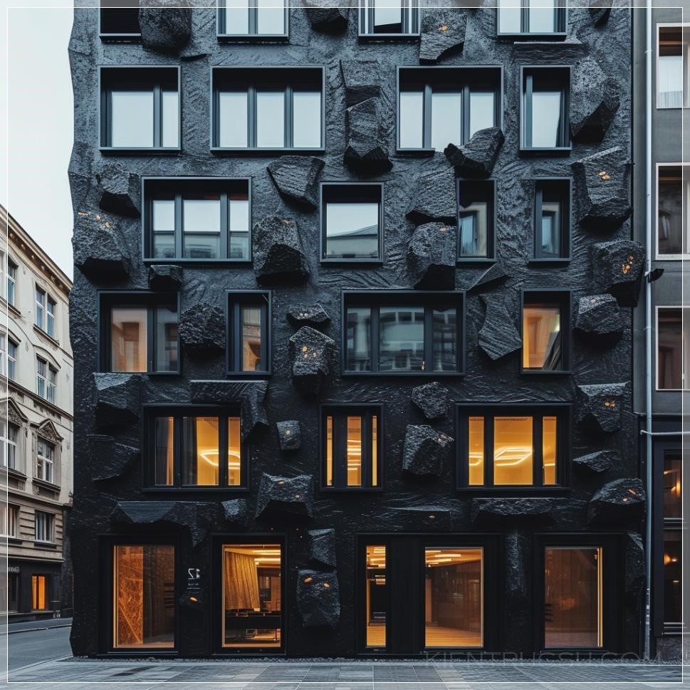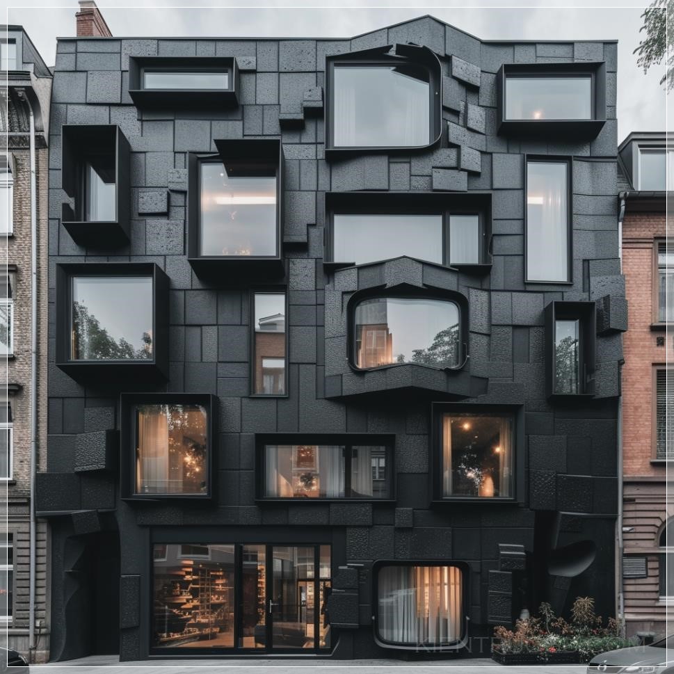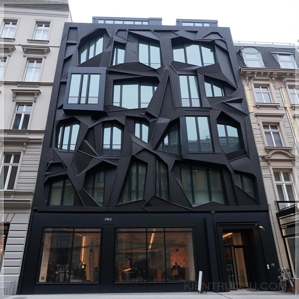 PROMPT: a black building with multiple windows and black cubes, in the style of ceramic street art, jagged edges, opaque resin panels, zeiss ikon zm, eco-friendly craftsmanship, neue sachlichkeit, ornate details --v 6.0 Ý Nghĩa: