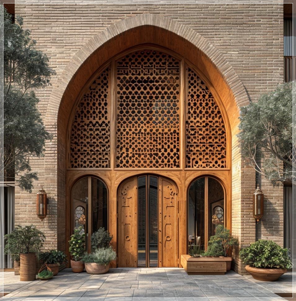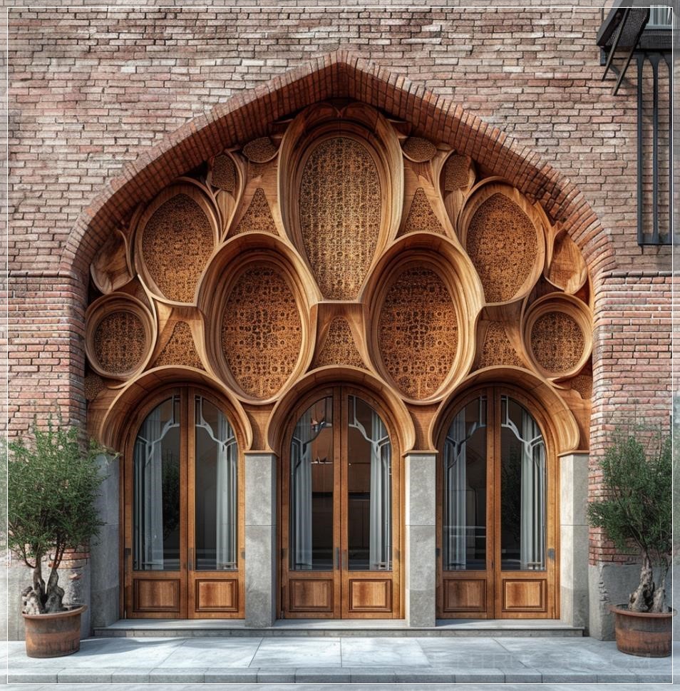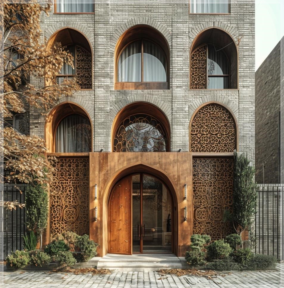 PROMPT: wall mounted windows and doors on a brick building, in the style of sculptural installations, orientalist landscapes, woven/perforated, #vfxfriday, confessional, neutral color palette, bentwood --ar 91:92 --s 750 --v 6.0 Ý Nghĩa: