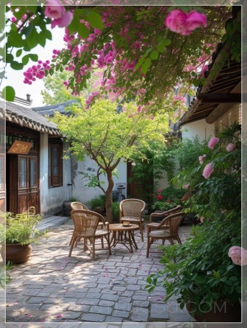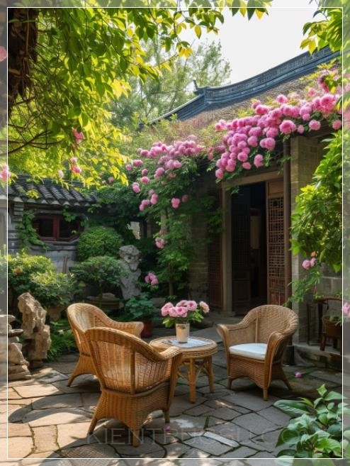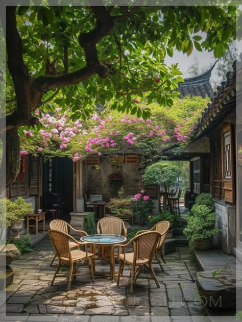 This pastoral courtyard is adorned with a blooming China rose garden on its surrounding walls, permeating the air with its sweet fragrance+A blooming magnolia tree shades several rattan chairs and a tea table, making it a perfect spot for relaxation and conversation+ Water trickles down from a man-made rockery,producing a delightful melody+The courtyard is lush with greenery and abundant flowers, brimming with vitality and natural ambiance, The main building is a traditional quadrangle courtyard surrounded by small independent rooms and courtyard walls, creating a compact yet uncluttered layout,Each room has its own function and blends seamlessly with the surrounding landscape+The entire courtyard embodies the unique charm of Chinese traditional architecture and culture+Sufficient light,sunlight through trees,Creative,HD, exquisite details,Light and shadow,light effect,Image Super-Resolution,High sharpness, high definition, exquisite Detail, high contrast, high saturation --ar 3:4 --v 6.0 --style raw