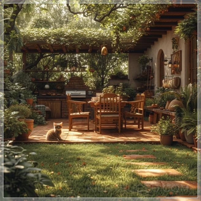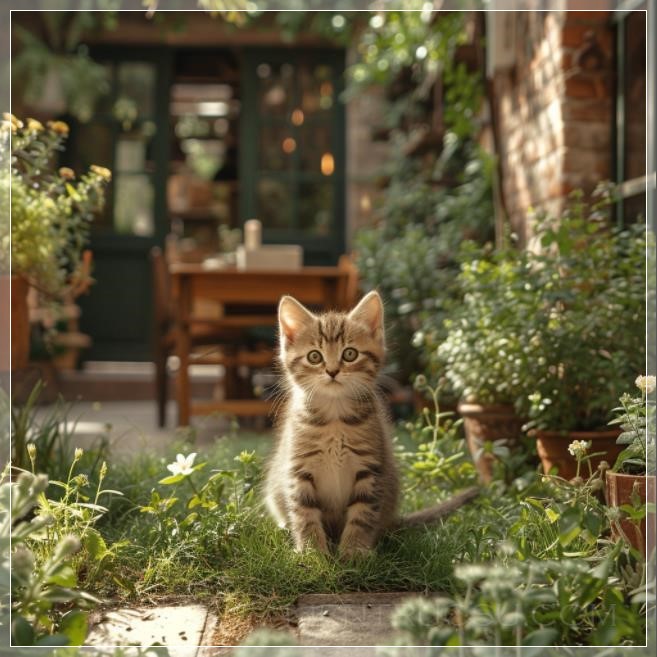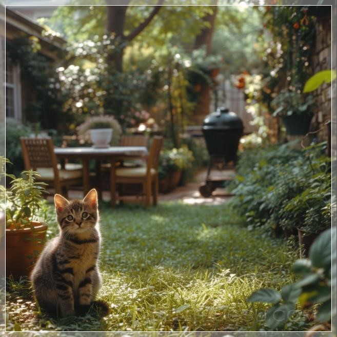 Capturing a frontal perspective, this image features a flourishing garden adorned with vibrant green plants thoughtfully arranged in symmetrical patterns, meticulously following the principles of landscape design. Adjacent to a barbecue, elegant garden furniture--a table and chairs--are perfectly positioned amidst a carpet of lush, green grass. At the heart of the composition sits an adorable kitten, charmingly centered and enhancing the scene's appeal. The arrangement adheres meticulously to the golden ratio, ensuring a harmonious balance, while sustainable light and shadow play contribute to the overall picturesque quality of the setting --v 6.0 --s 750