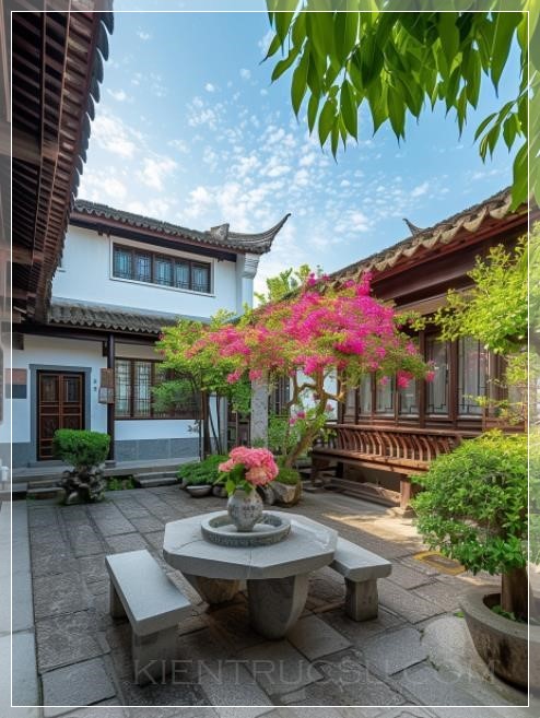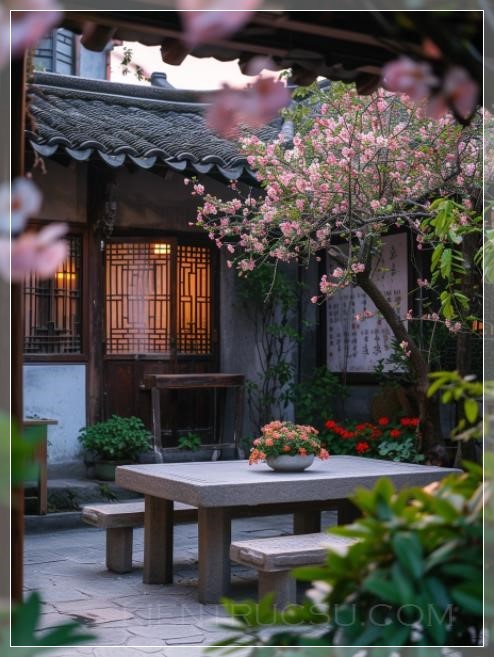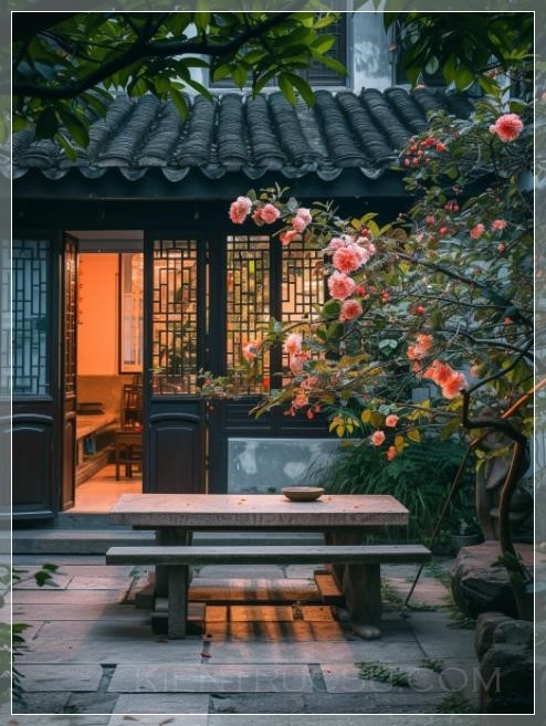 real shot, evening, courtyard design, back garden landscape, master masterpiece, jiangnan courtyard, country style, one-bedroom building, stone table, stone bench, flower arrangement, a beautiful begonia tree in the corner, light pink begonia flower, main framing, wide-angle lens, panoramic photography, exquisite details, high definition picture, best quality --ar 3:4 --v 6.0
