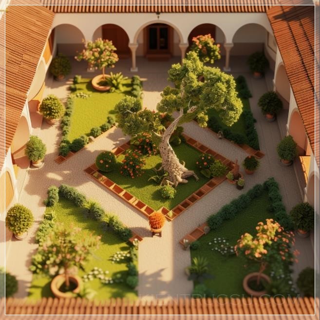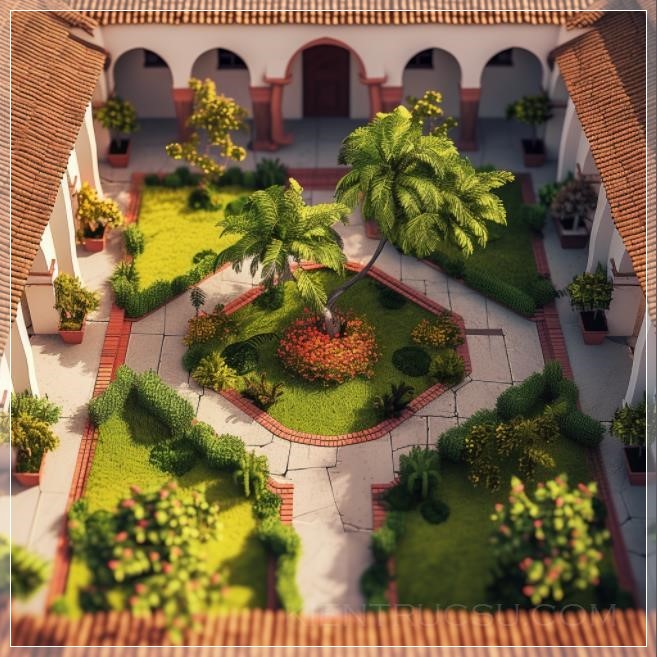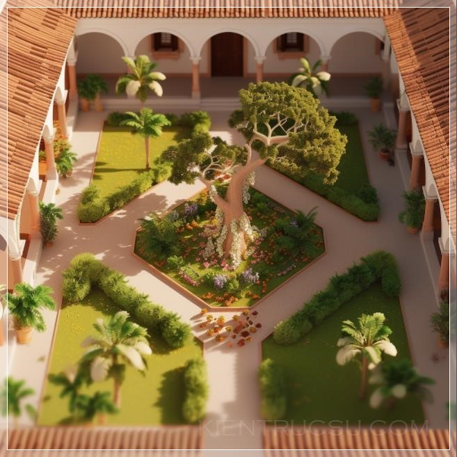 PROMPT: animated, cute model of a spanish hacienda in a u shaped layout, isometric view. High arches, high ceilings, warm colors, the center is a beautiful garden with lush grass, a huge tree and flowers --s 50 --v 6.0 Ý Nghĩa: