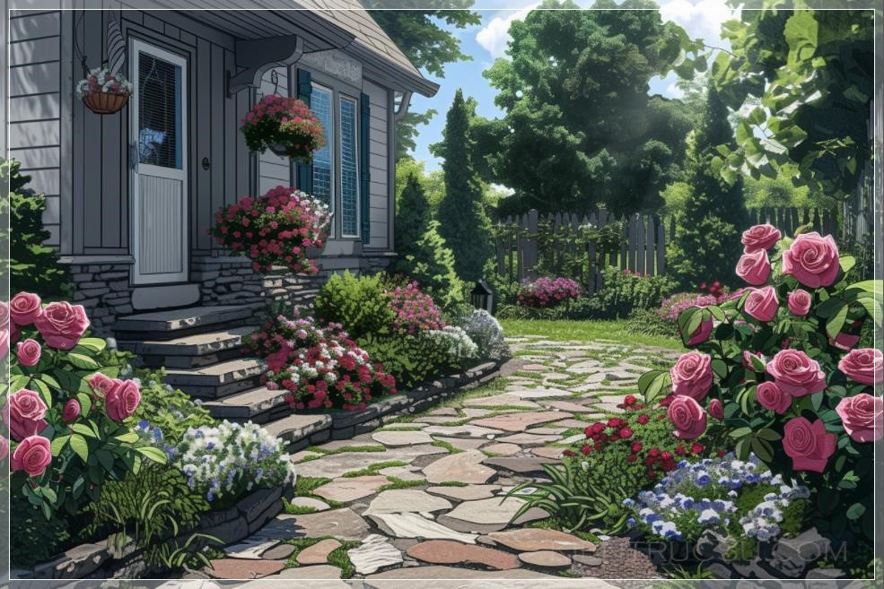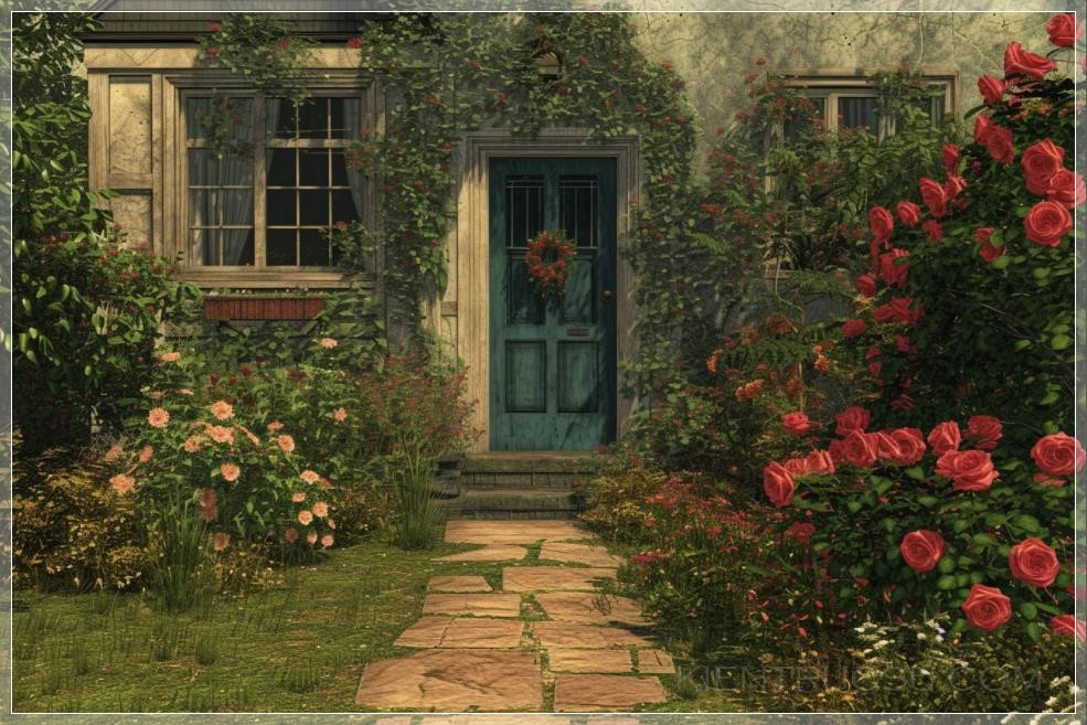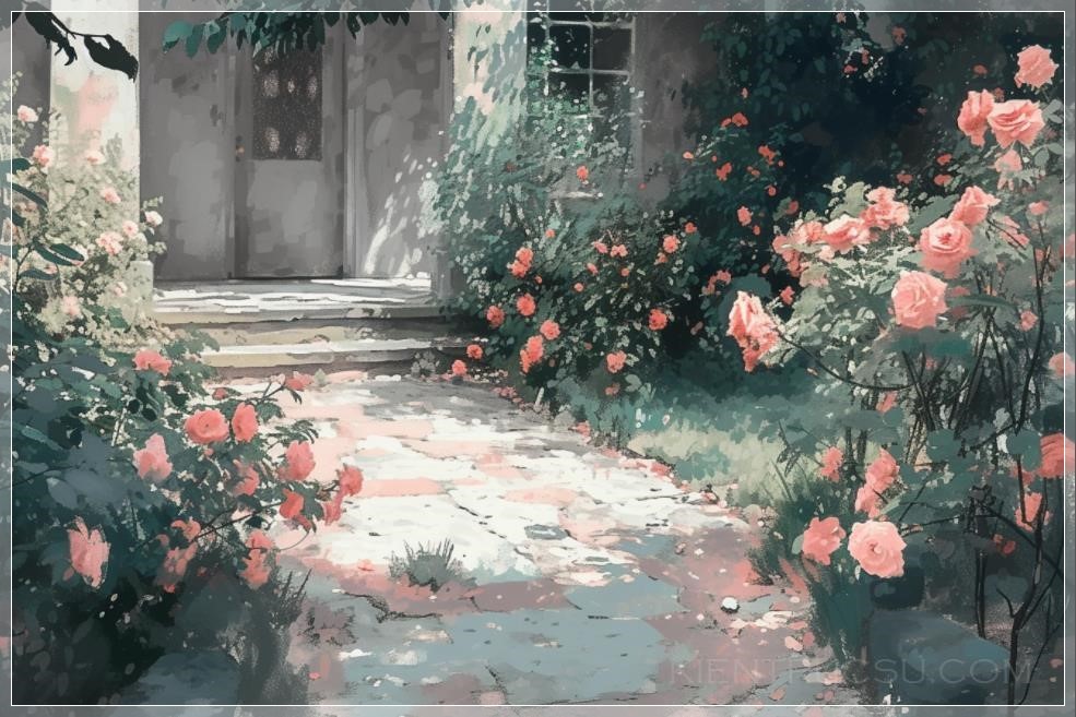 a front yard decorated with roses, in the style of muted color palette, historical painting, light gray and light brown, weathercore, in the style of Maurice Prendergast, 500–1000 ce, trompe-l'œil illusionistic detail, light maroon and dark emerald, sketchfab, charcoal sketches, hudson river school, digitally enhanced --ar 3:2 --stylize 175 --v 6.0 --style raw --iw 0.1