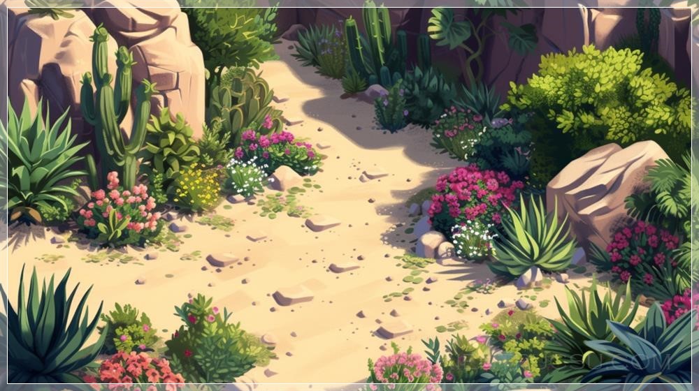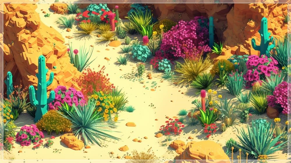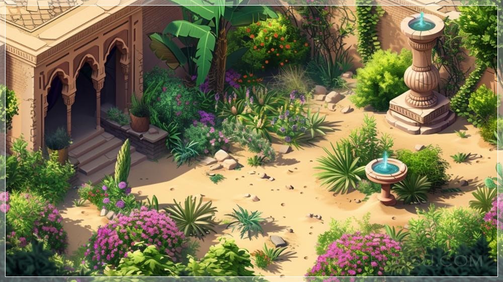 PROMPT: secluded gardens full of fragrant flowers and plants, desert, sand, isometric, mobile games art, sharp image, --ar 16:9 --v 6.0 Ý Nghĩa: