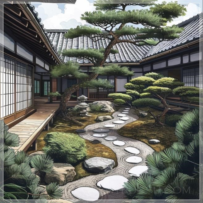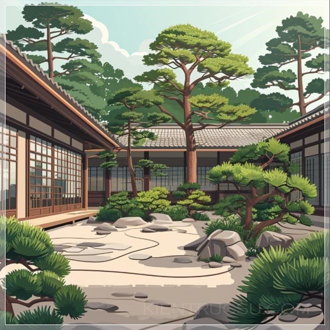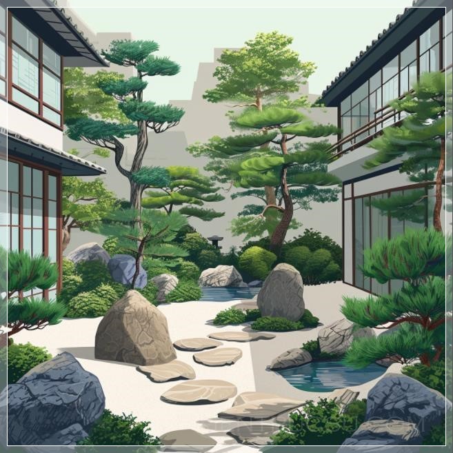 PROMPT: Flat perspective, square Japanese courtyard, Zen style, garden, pine trees, stones, with artistic conception --ar 1:1 --v 6.0 Ý Nghĩa: