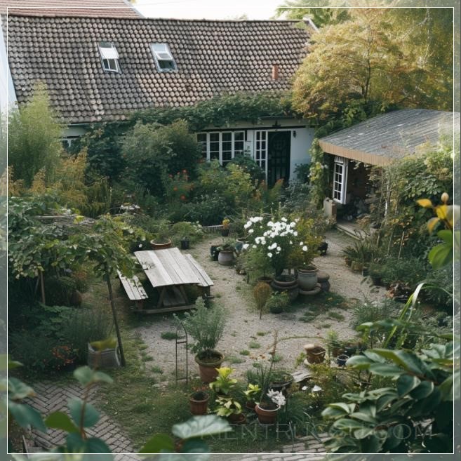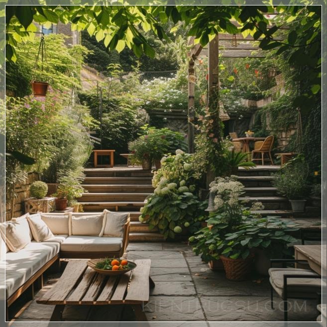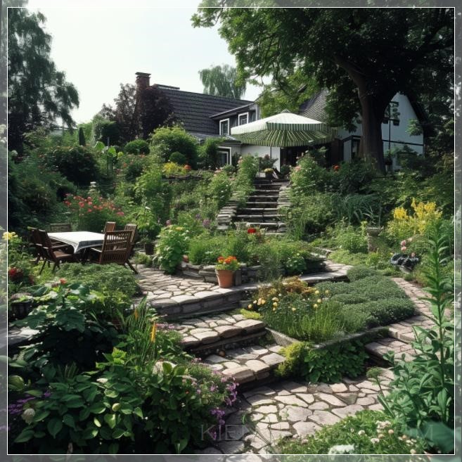 PROMPT: A garden behind a country house, 20 x 30 m, a terrace for sitting, various levels, lots of plants and cosy nooks --v 6.0 Ý Nghĩa: