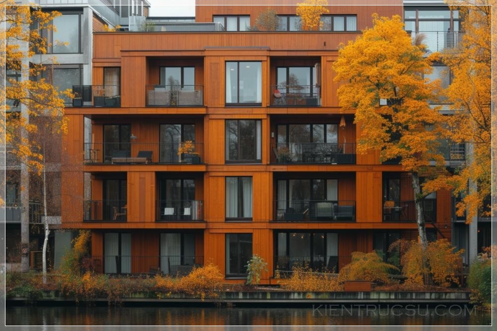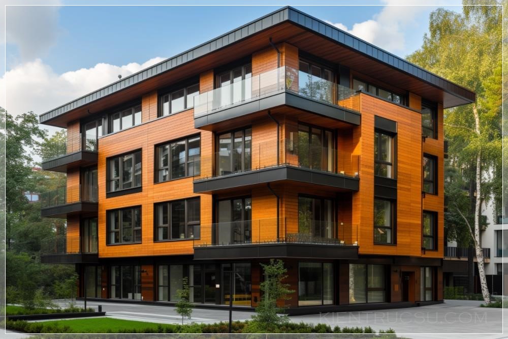 a medium-rise residential apartment building, four floors tall, the building is constructed with pressure-treated wood, such that it is water resistant, the wood is shaped as a thick blocks and planks of an oak wood texture of regular angles, these blocks and planks are stacked to created the walls of the building, the windows are large and with black frame, this is a functional building with a natural material design with exterior appearance of textured wood with rings, veins and knots, in the background a bright Swedish summer day, a few birch trees and a lake are visible, photorealistic promotion for a new style of eco-living in the north --ar 3:2 --v 6.0 --s 400 --c 25