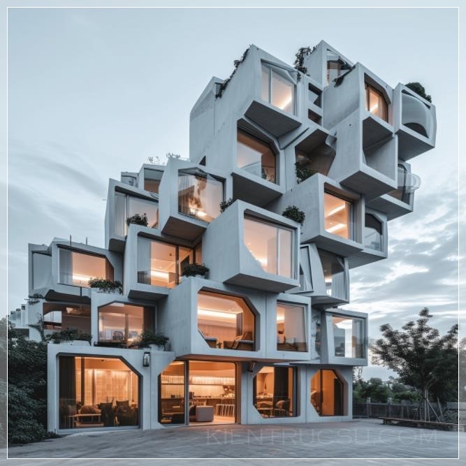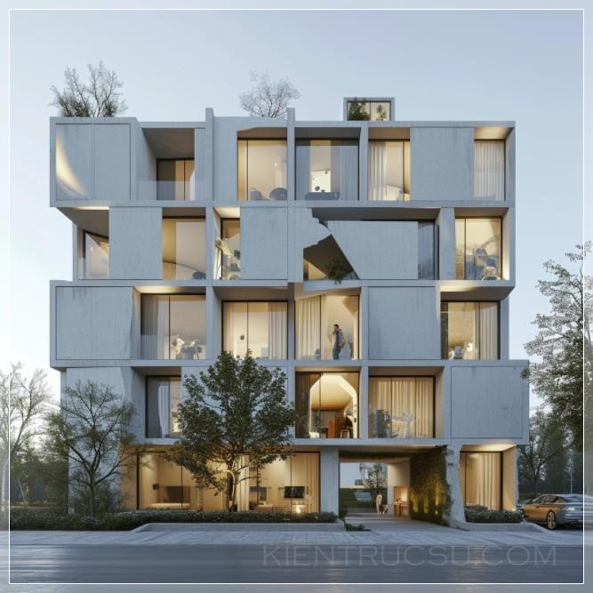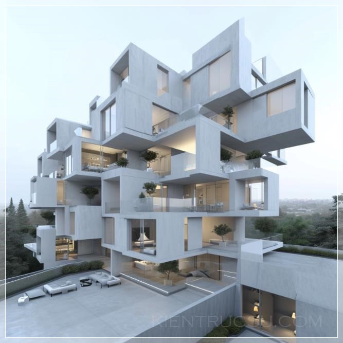 PROMPT: modular parametric housing apartment building facade, terraced,white,concrete,glass --v 6.0 Ý Nghĩa: