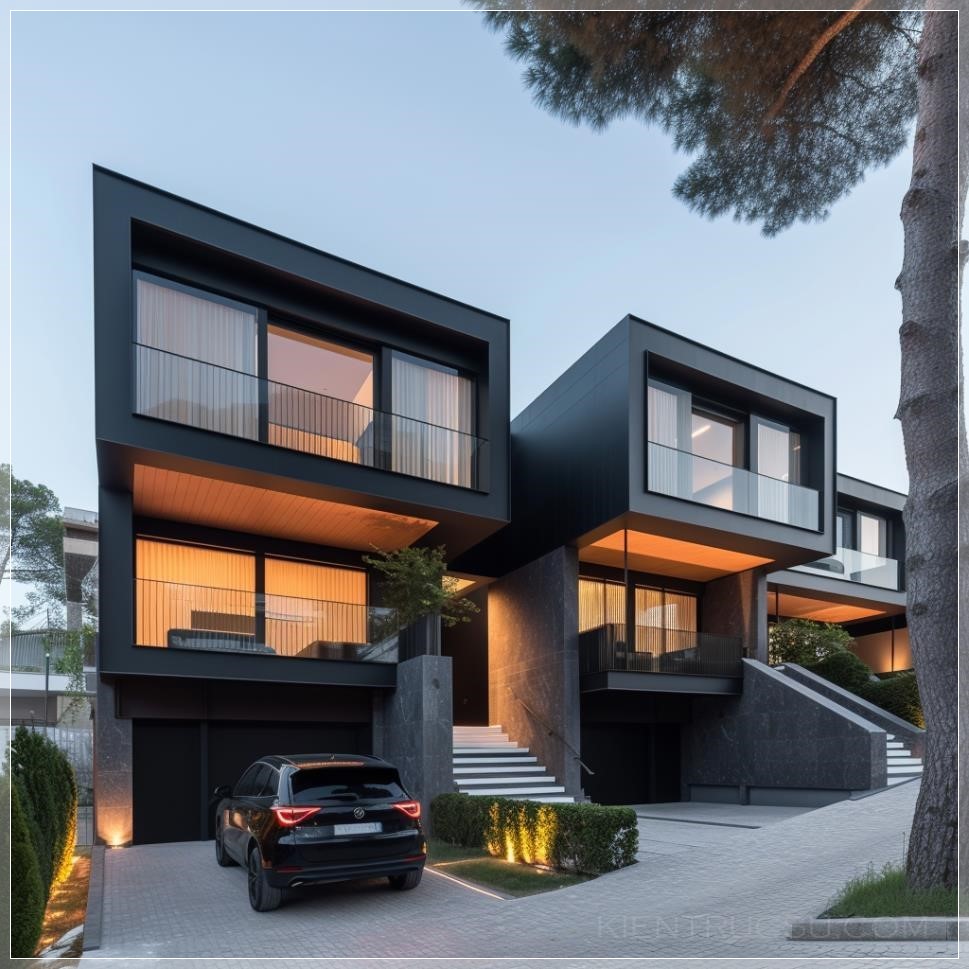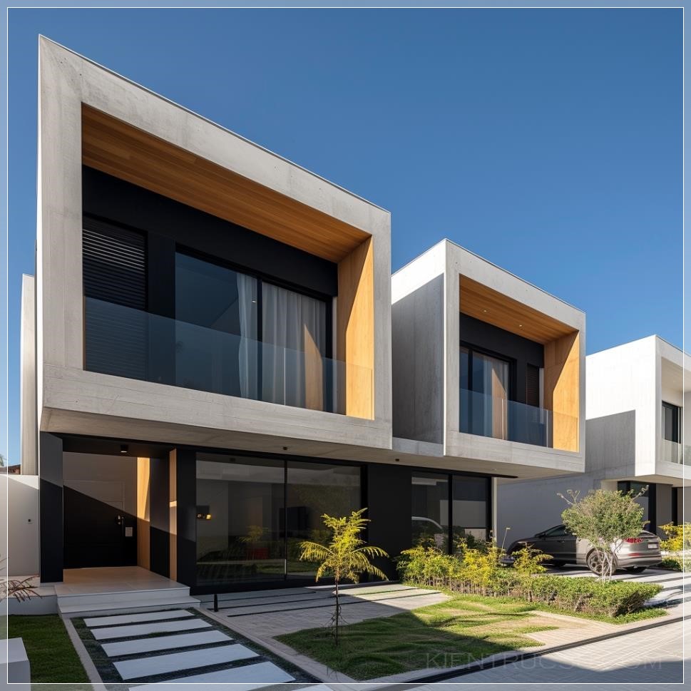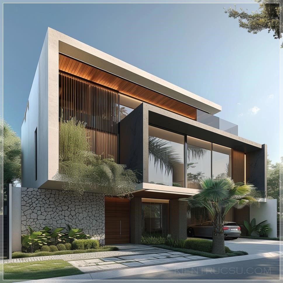 PROMPT: Modern facades with straight lines, geometric shapes and hollow elements, brises with cobogós, landscaping, parking space for two vehicles, independent pedestrian entrance, --v 6.0 Ý Nghĩa: