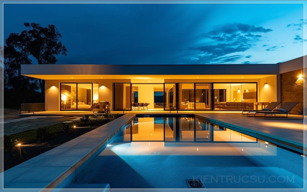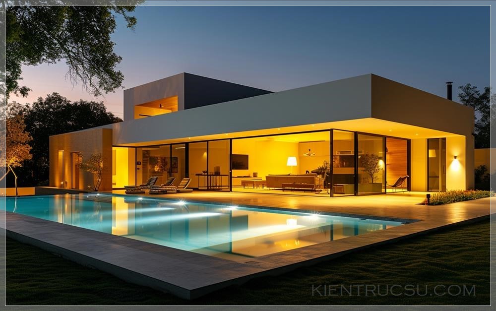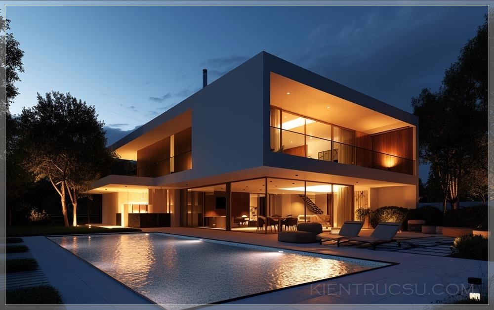 PROMPT: an modern house with a swimming pool at night, in the style of light gold and white, australian landscape, 32k uhd, mood lighting, perceptive --ar 8:5 --no cartoon --v 6.0 Ý Nghĩa: