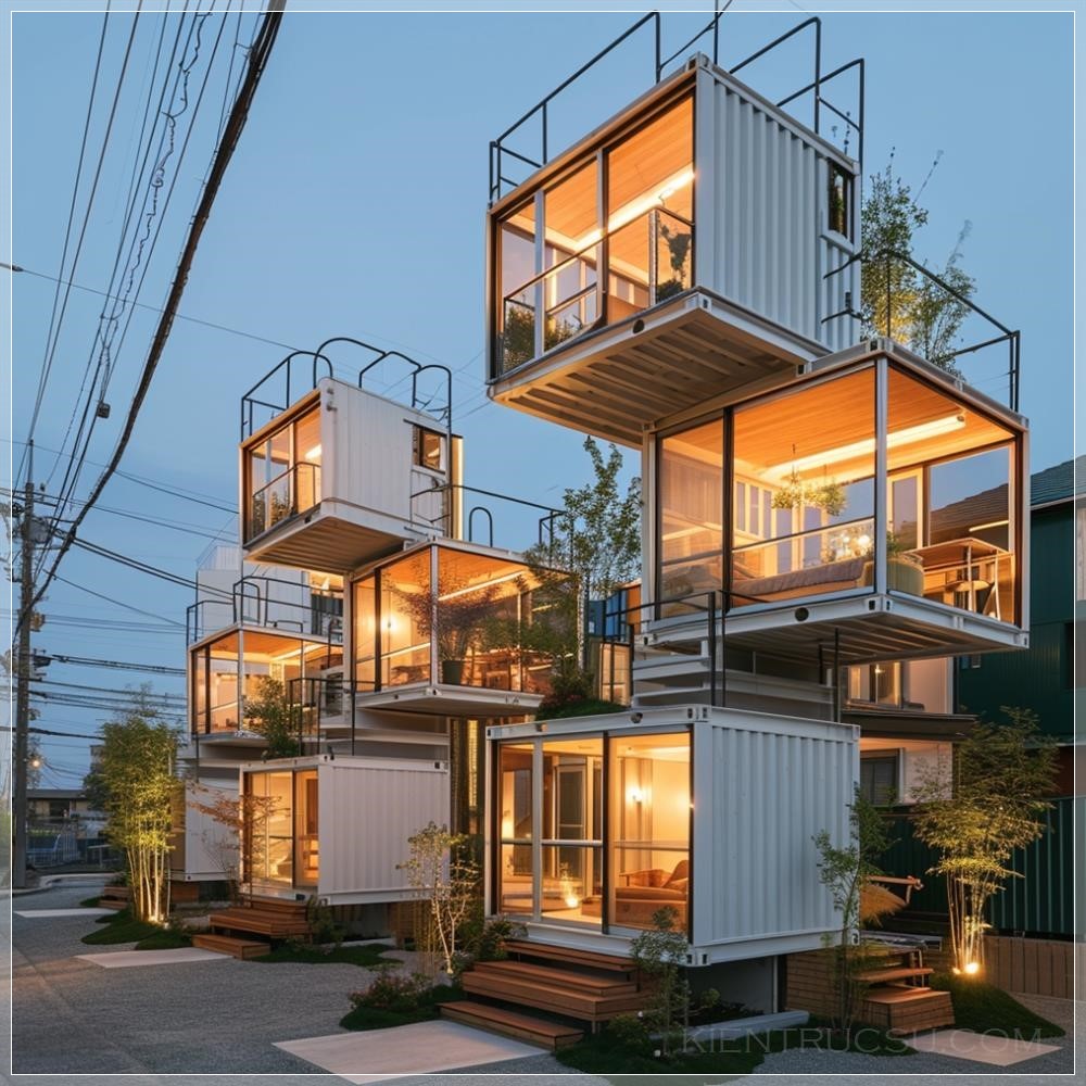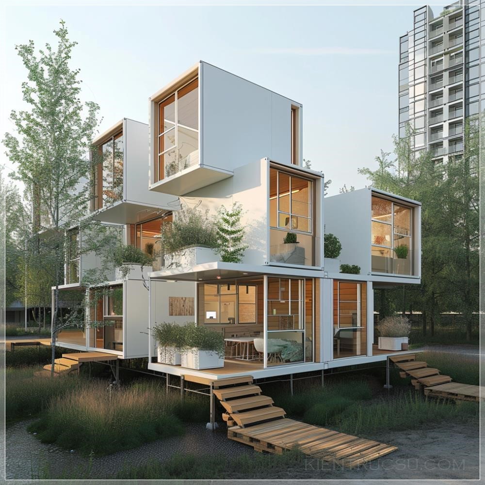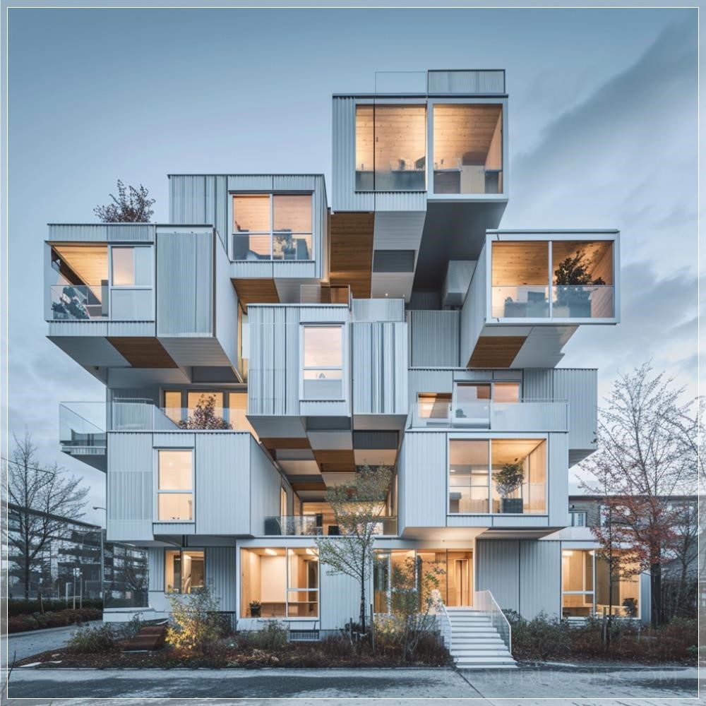 Housing compound consisting of multiple scattered 25 square meter micro houses composed of 3 stacked rectangular volumes that stair step around eachother. Mass timber framing with white metal cladding composes the structure, ribbon glass for unobstructed views. middle level has a balcony. Complex sits in a vacant urban infill lot. Planted edge condistions create a sense of privacy despite being a compact urban condition. --v 6.0 --style raw