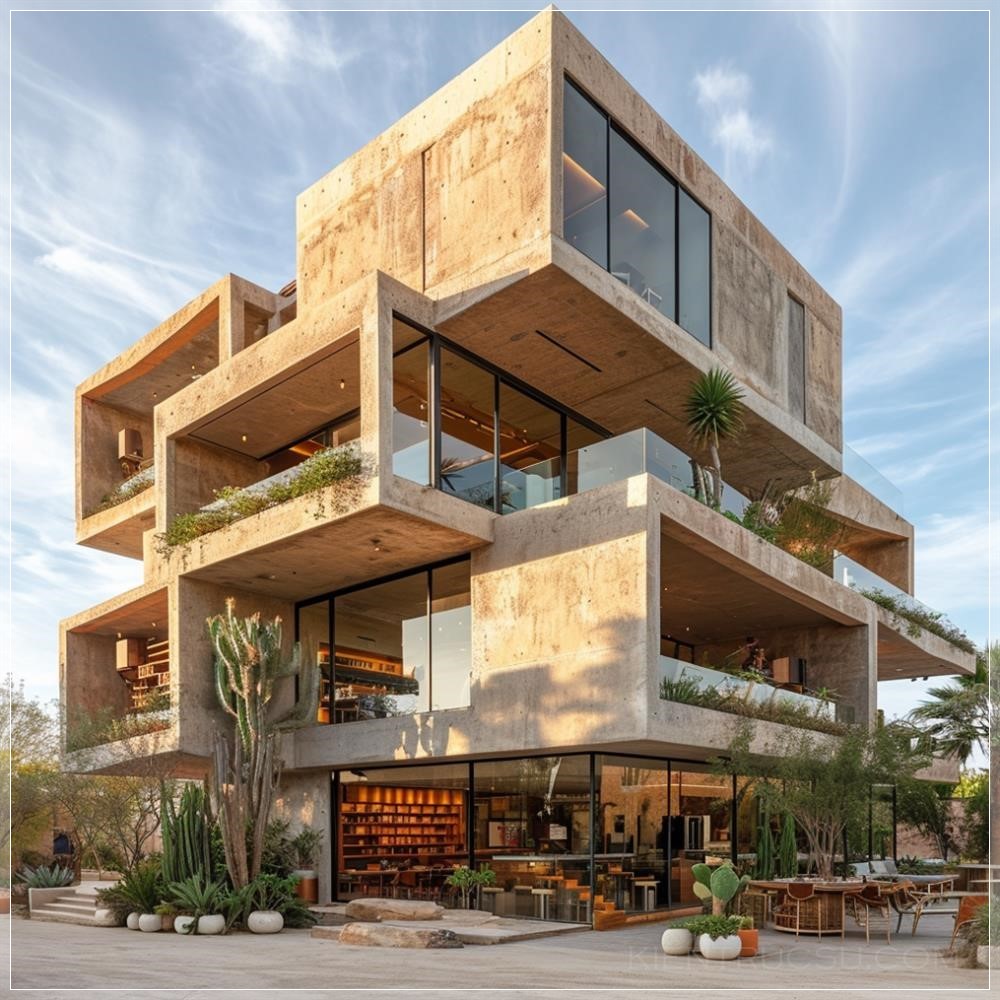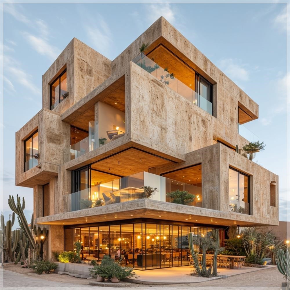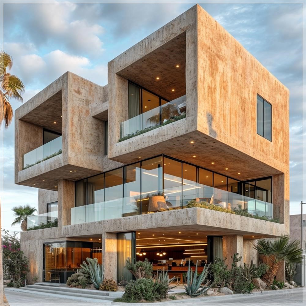 Five-level building in San Jose del Cabo featuring beige concrete textures on the first two levels with commercial premises. The remaining levels showcase non windows rammed earth finish. Situated on a corner, surrounded by desertic vegetation. Wide-angle lens, aperture f/5.6, shutter speed 1/200 sec, ISO 400 --s 250 --v 6.0