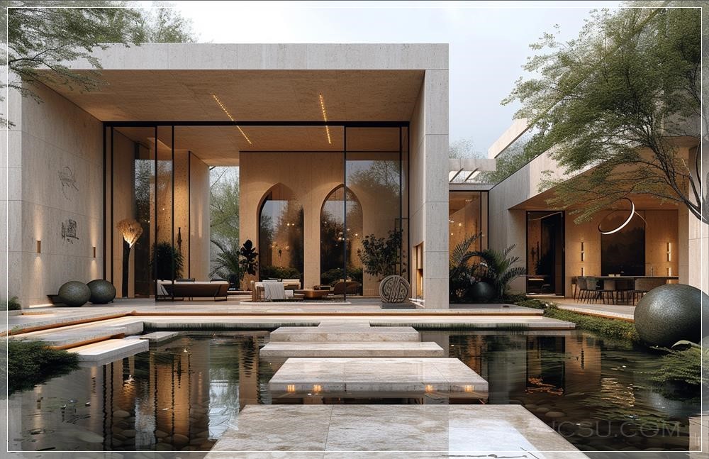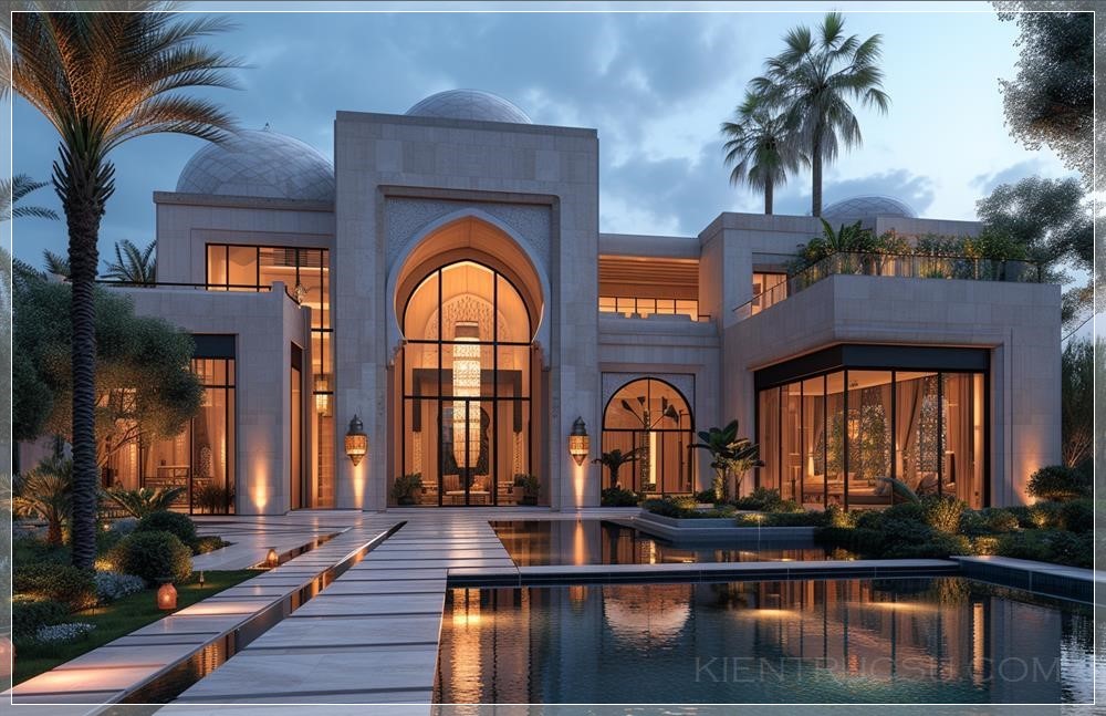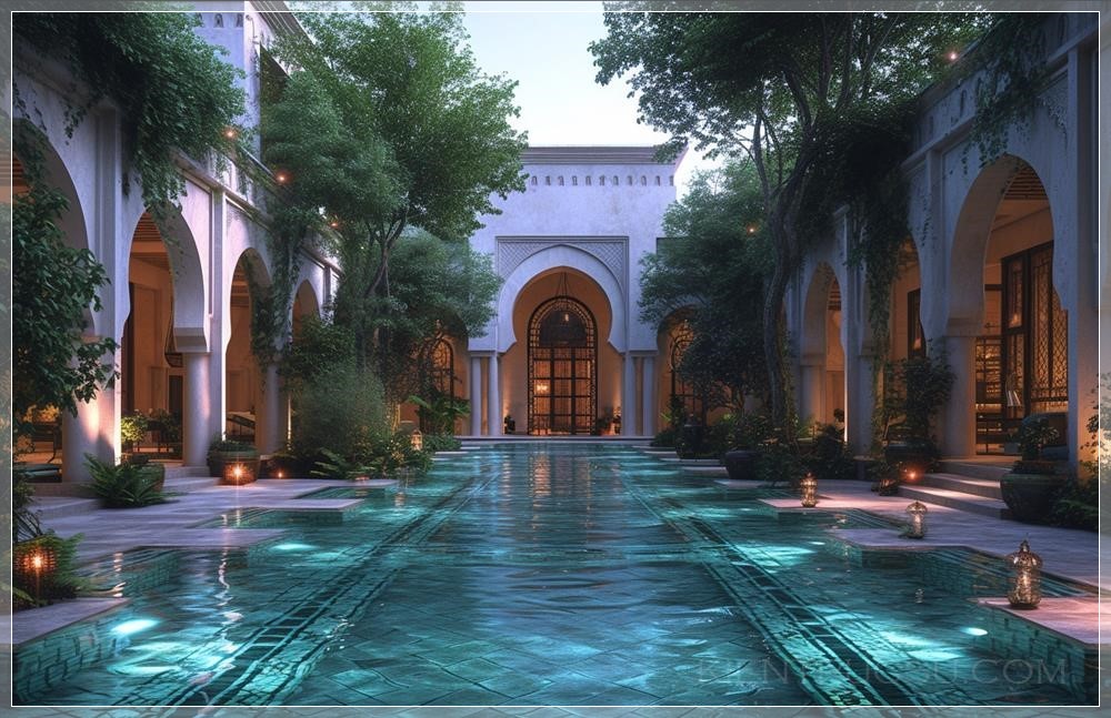 modern arab exterior,wide angle empty floor,in the style of pastoral charm,Ramadan mood,Night, Arab villa,dau al set, textural harmony, youthful energy, Highly detailed, mediterranean landscapes, hurufiyya, minimalistic --ar 128:83 --stylize 750 --v 6.0