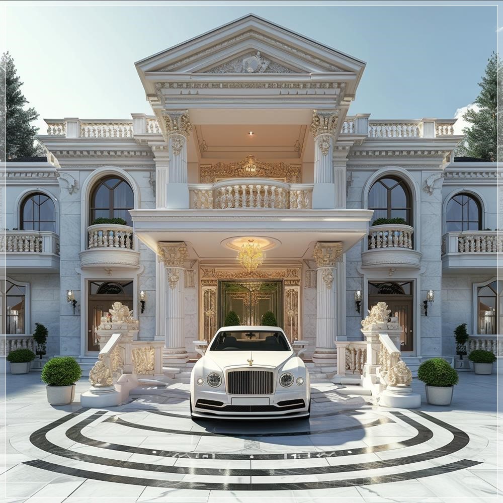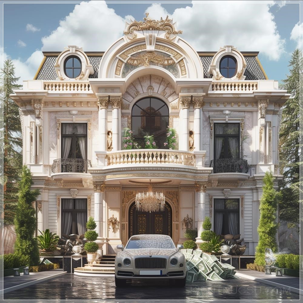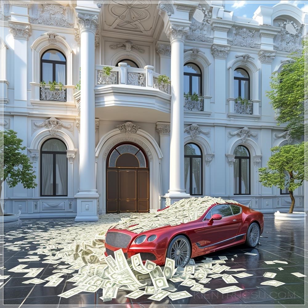 PROMPT: spectacular house facade, with a luxury car and a lot of money in dollars --v 6.0 Ý Nghĩa: