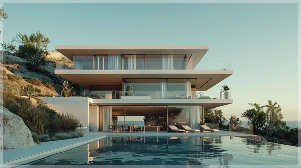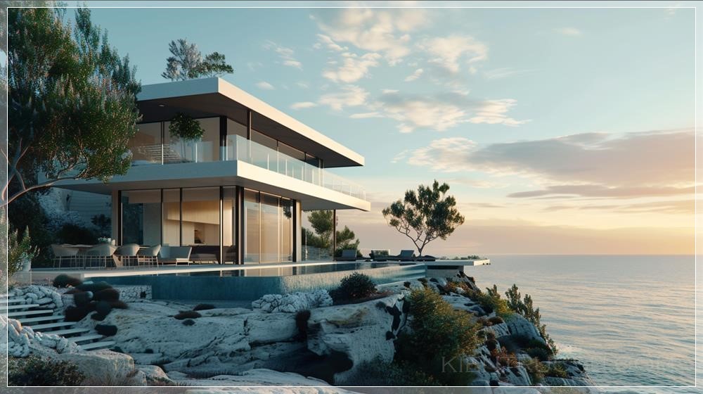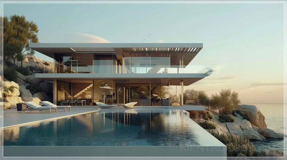 PROMPT: a modern house on ibiza on top on a hill surrounded by the ocean, mondern, much glass, 2 levels, swimming pool, modern style mush glass, 3d rendering --ar 16:9 --v 6.0 Ý Nghĩa: