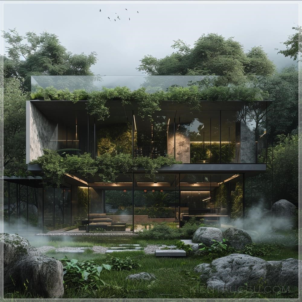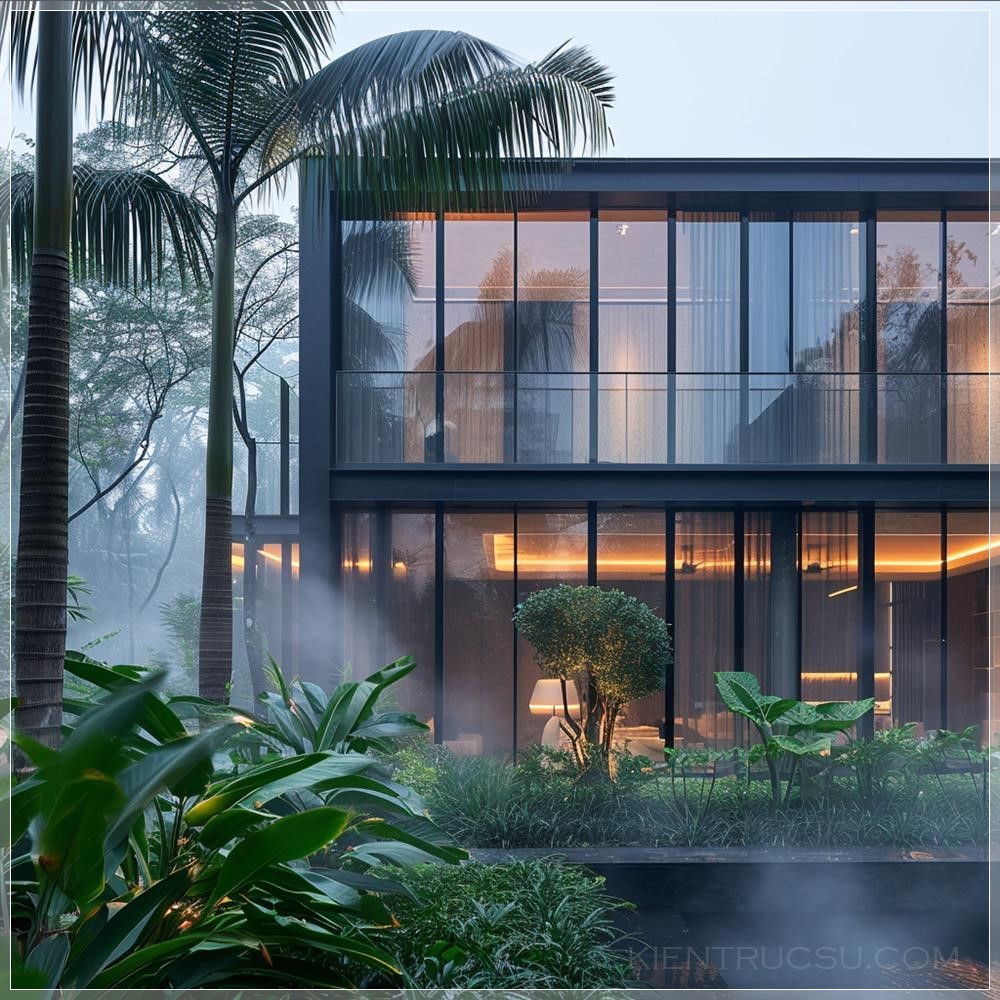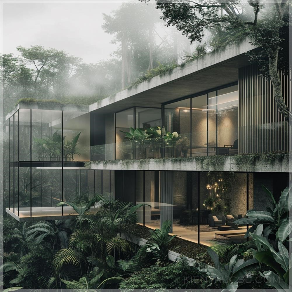 PROMPT: Crown facade villa, glass, mist, rich vegetation --v 6.0 Ý Nghĩa: