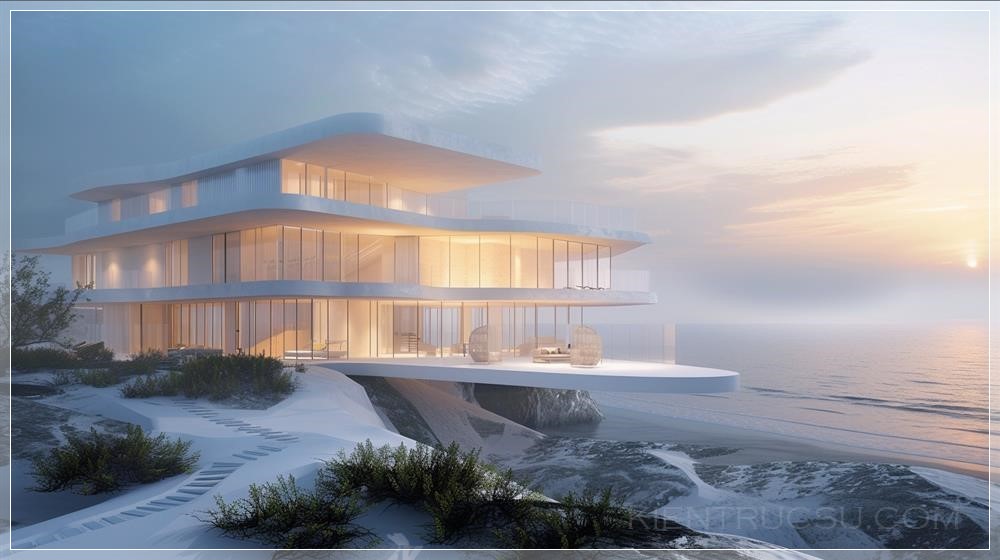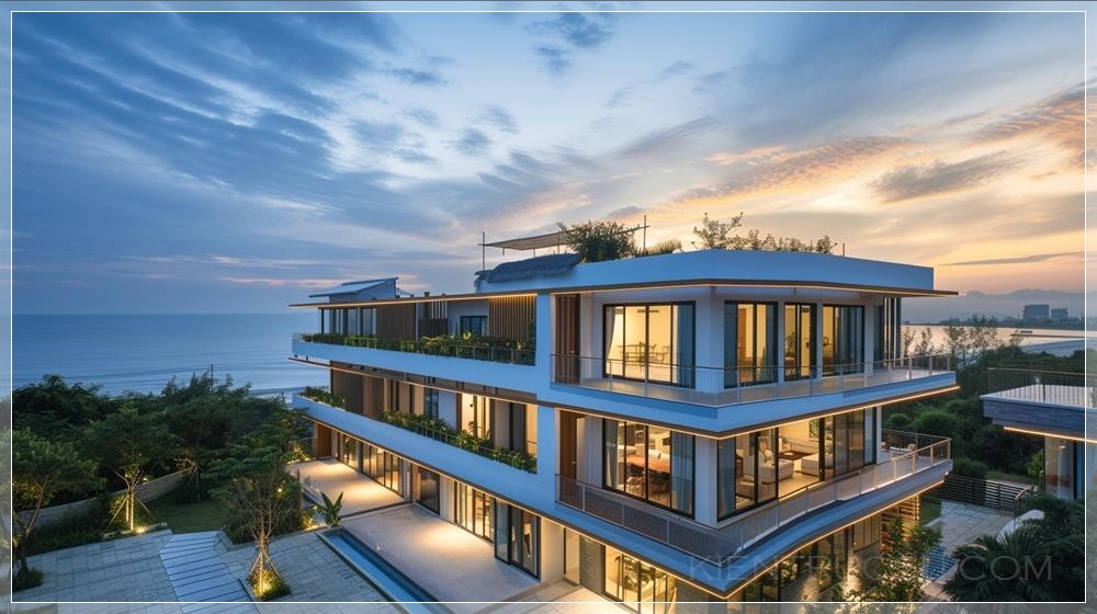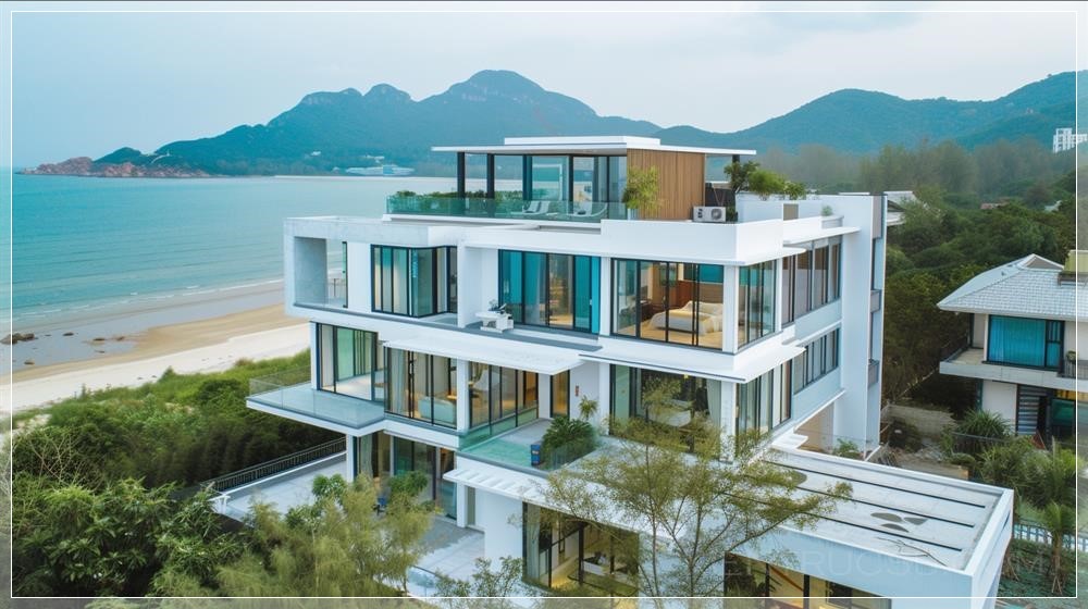 A four-storey homestay building with many rooms in a modern yet minimalist design, ideally located and facing the sea. The main color of the building is white to reflect sunlight and reduce heat absorption, and the roof is designed in light gray or sky blue to echo the sea and sky. The exterior walls use large glazed Windows designed to maximise the introduction of natural light and provide unobstructed views of the sea. Key features and elements: Rooftop terrace: The top floor has a spacious terrace with relaxed outdoor furniture, allowing guests to enjoy the sea breeze and sunset views. Green vegetation: Proper amount of green vegetation is planted around the building and on the roof to add natural beauty to the guest house while providing natural shade and purifying the air. Eco-friendly materials: Building materials are environmentally sustainable, such as recycled wood, natural stone and treated, recyclable glass. Open plan: The main living areas are open plan with sliding glass doors connecting the indoor and outdoor Spaces to enhance ventilation and natural light. Path and lighting: The path to the sea is paved with natural stone and lit at night by hidden LED lights for a romantic atmosphere. Color and material: Color: White and light tones dominate, with blue or green details to reflect the colors of the ocean and nature. Materials: A large amount of wood and natural stone are used, and corrosion-resistant metal materials can be used for external structures to reduce sea breeze erosion. With this design, the Coastal homestay not only provides a comfortable accommodation experience, but also becomes the ideal place to see and experience the natural beauty of the seaside. --ar 16:9 --v 6.0