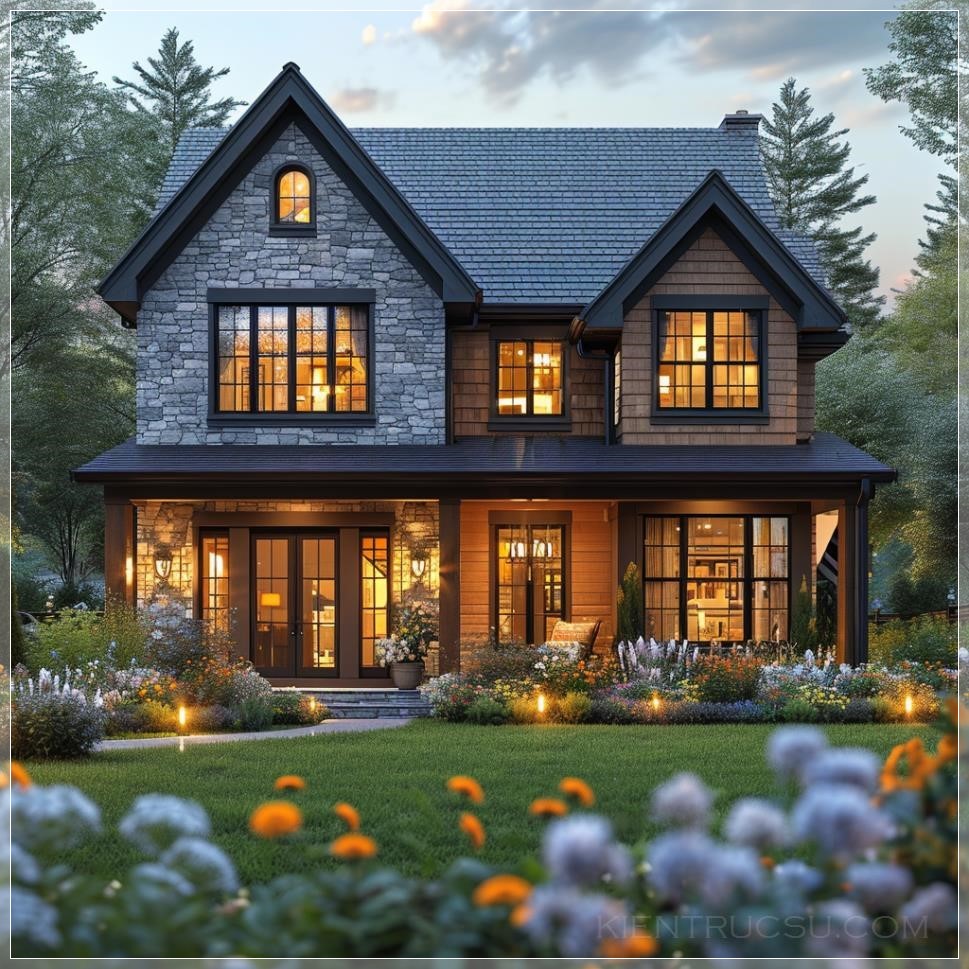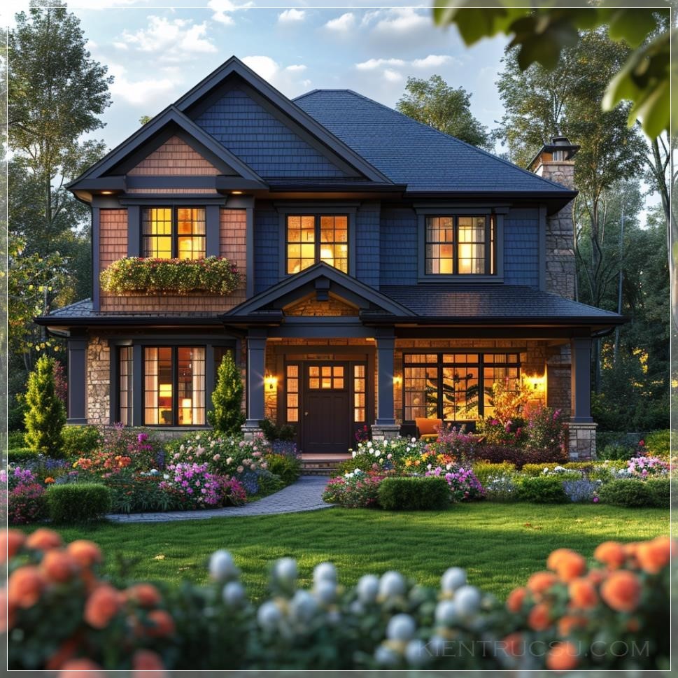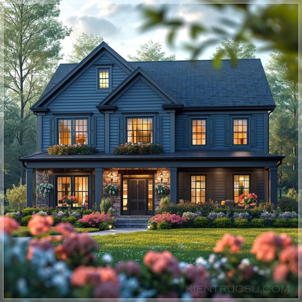 A photorealistic image of a charming two-story suburban house. The focus is on the freshly painted exterior, showcasing a modern color palette. The house is surrounded by a well-manicured lawn with blooming flowers. The lighting is warm, indicating late afternoon, enhancing the colors and textures of the paint and siding. The angle is from the front yard, slightly angled to capture both the front and the side of the house, highlighting the contrast between the new exterior and the lush greenery. --s 750 --v 6.0