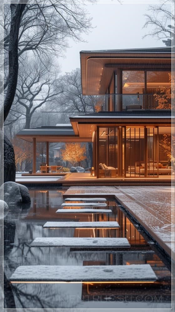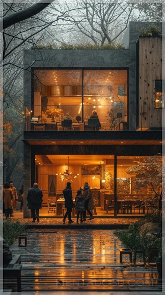 Modern and minimalist wooden courtyard, with a New Year's atmosphere. On New Year's Eve, characters appear in the picture, and family members gather in the courtyard. The minimalist style creates a warm and lively atmosphere, with warm colors that are realistic and realistic --ar 9:16 --s 750 --v 6.0