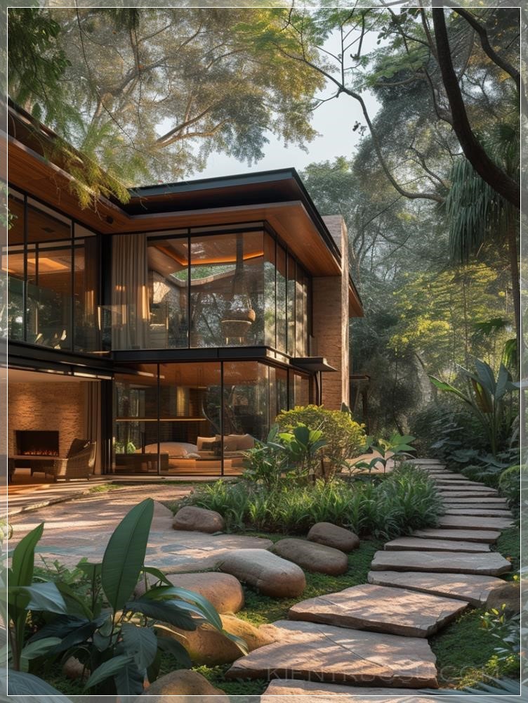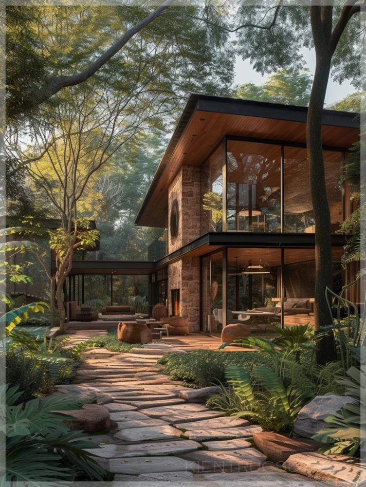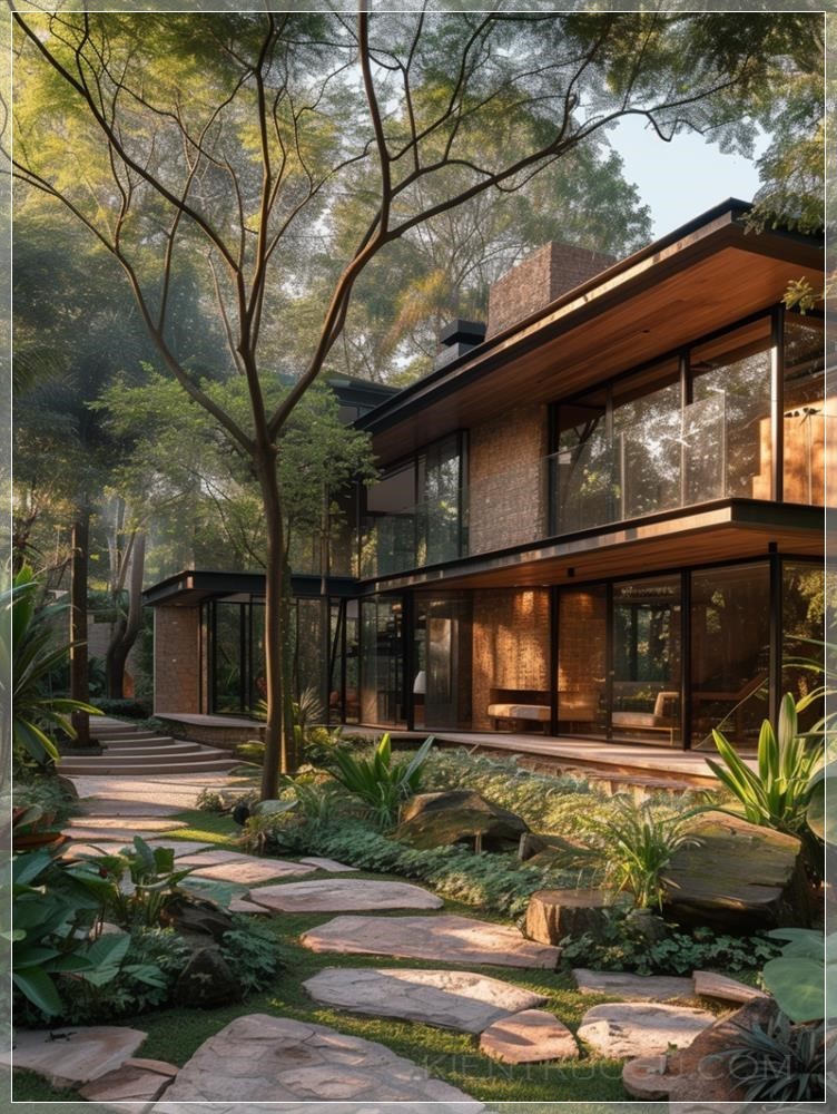 In this captivating image, a successful businessman's abode stands as a harmonious union of modern luxury and natural beauty. Nestled within a verdant forest, the contemporary architectural masterpiece seamlessly integrates with its surroundings through expansive glass walls and a wooden facade, inviting the tranquility of nature indoors. The play of sunlight creates enchanting patterns on the exterior, while a stone pathway winds through a meticulously landscaped garden, leading to a private courtyard furnished for contemplative moments. Inside, the open-concept living space and home office offer panoramic views of the lush woodland, accentuated by tasteful decor that balances modern elegance with rustic charm. A grand fireplace in the central living area adds warmth, and the bedroom, adorned with floor-to-ceiling windows, provides breathtaking views of the moonlit forest. This retreat encapsulates the epitome of success, where the businessman finds solace and inspiration in a haven that effortlessly blends sophistication with the serenity of nature. --ar 3:4 --s 150 --v 6.0