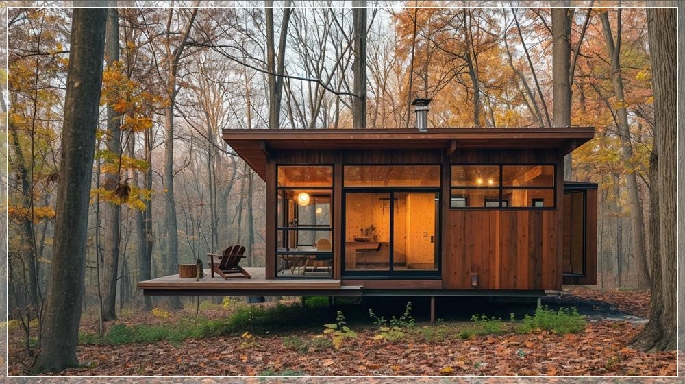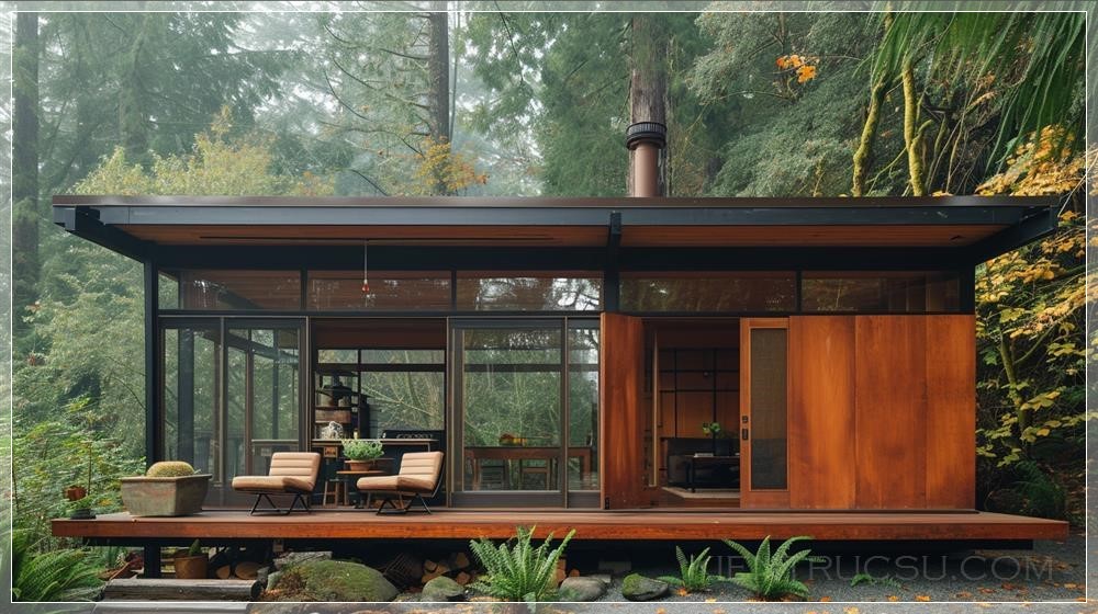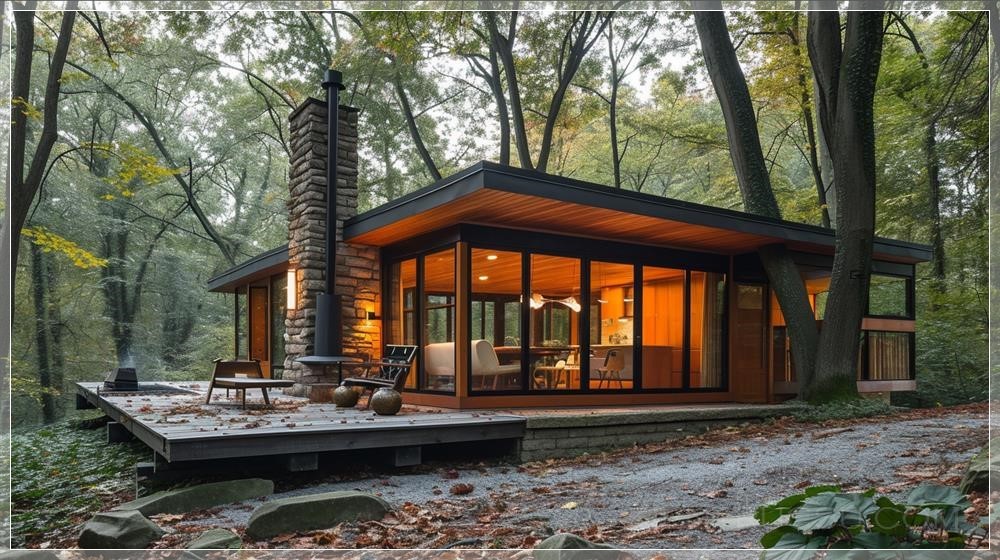 PROMPT: small cabin with wooden walls, large windows, post-minimalist structures, midcentury modern, clay title, contemporary candy-coated --ar 16:9 --v 6.0 Ý Nghĩa: