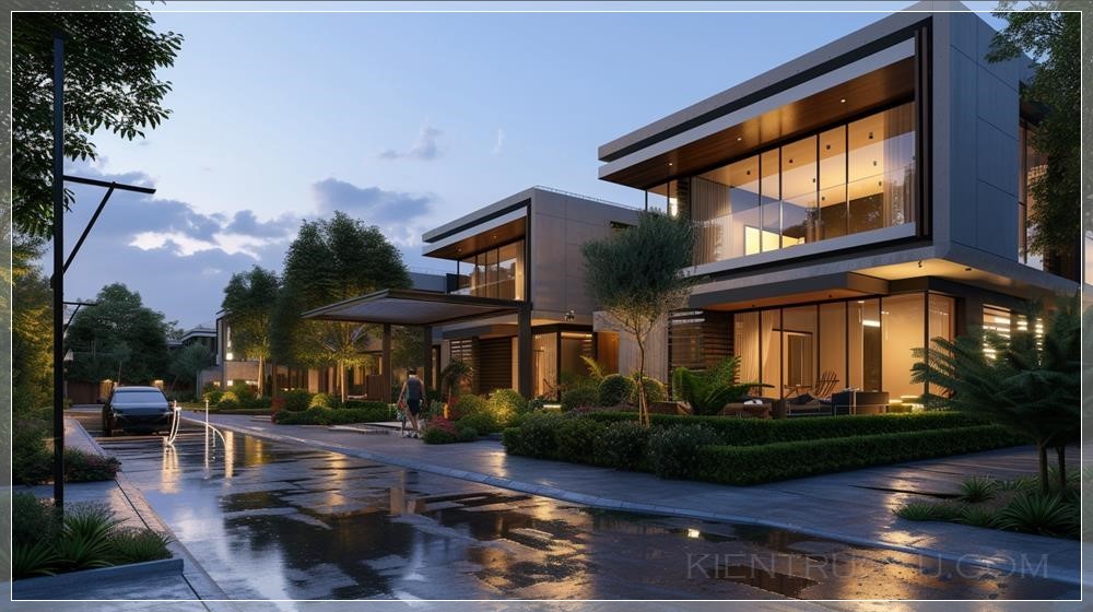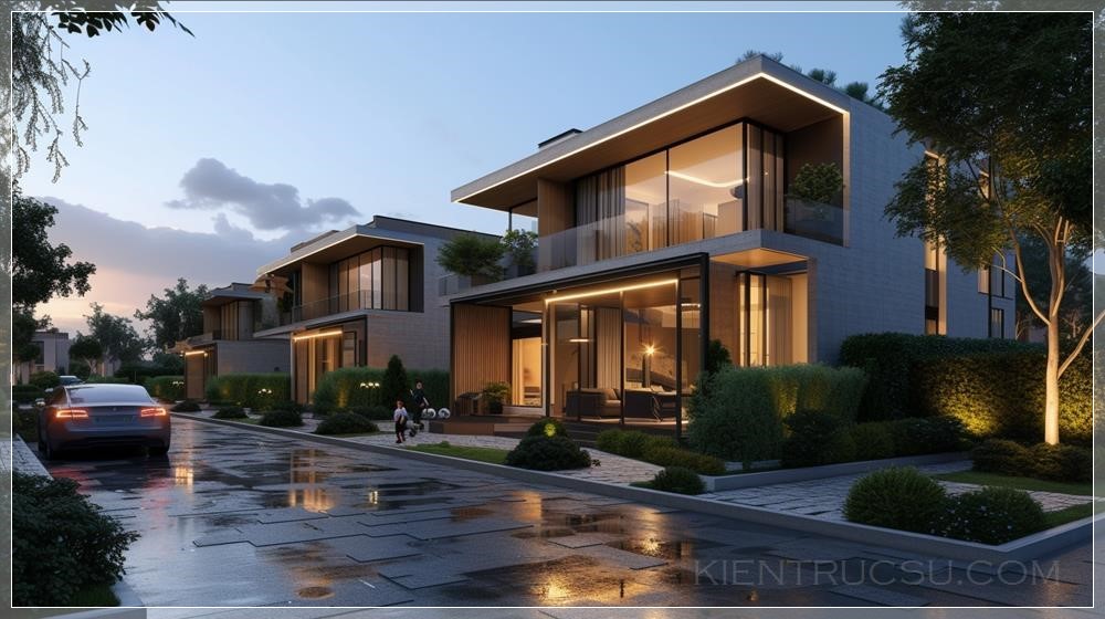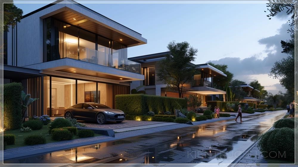 3d rendering frontal view of a modern luxurious houses with lush gardens and neat hedges in a high-end residential neighborhood during evening, children playing soccer in the street, wet asphalt reflecting the soft sunset light, a sleek electric car parked on the side, serene atmosphere, vray, octane render --v 6.0 --style raw --ar 16:9