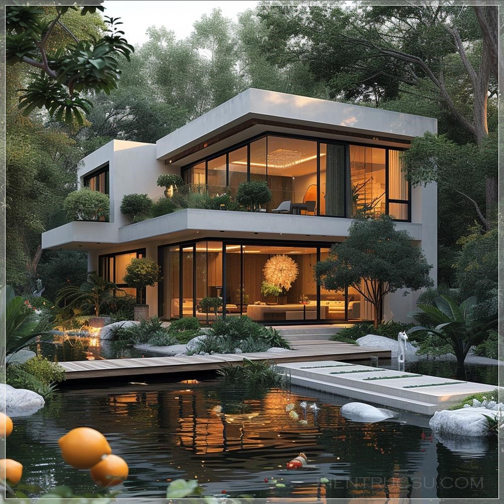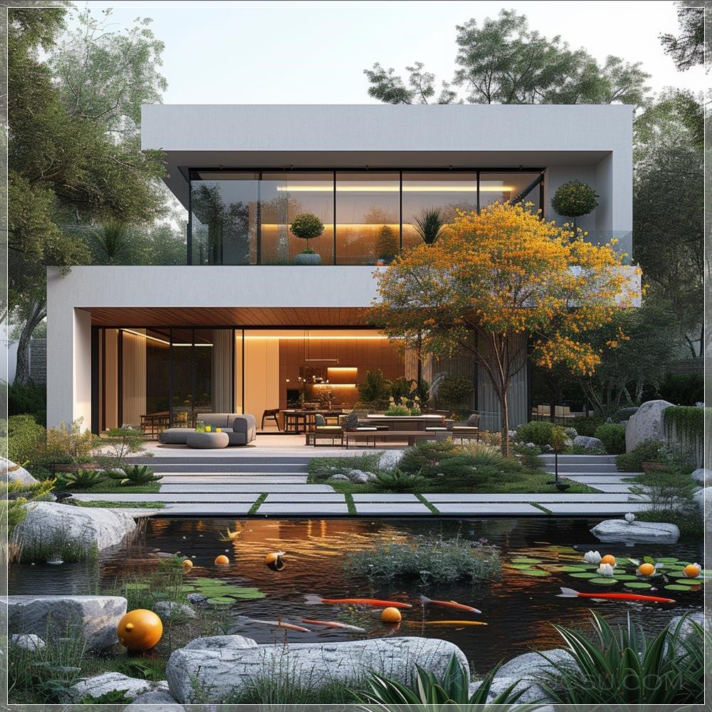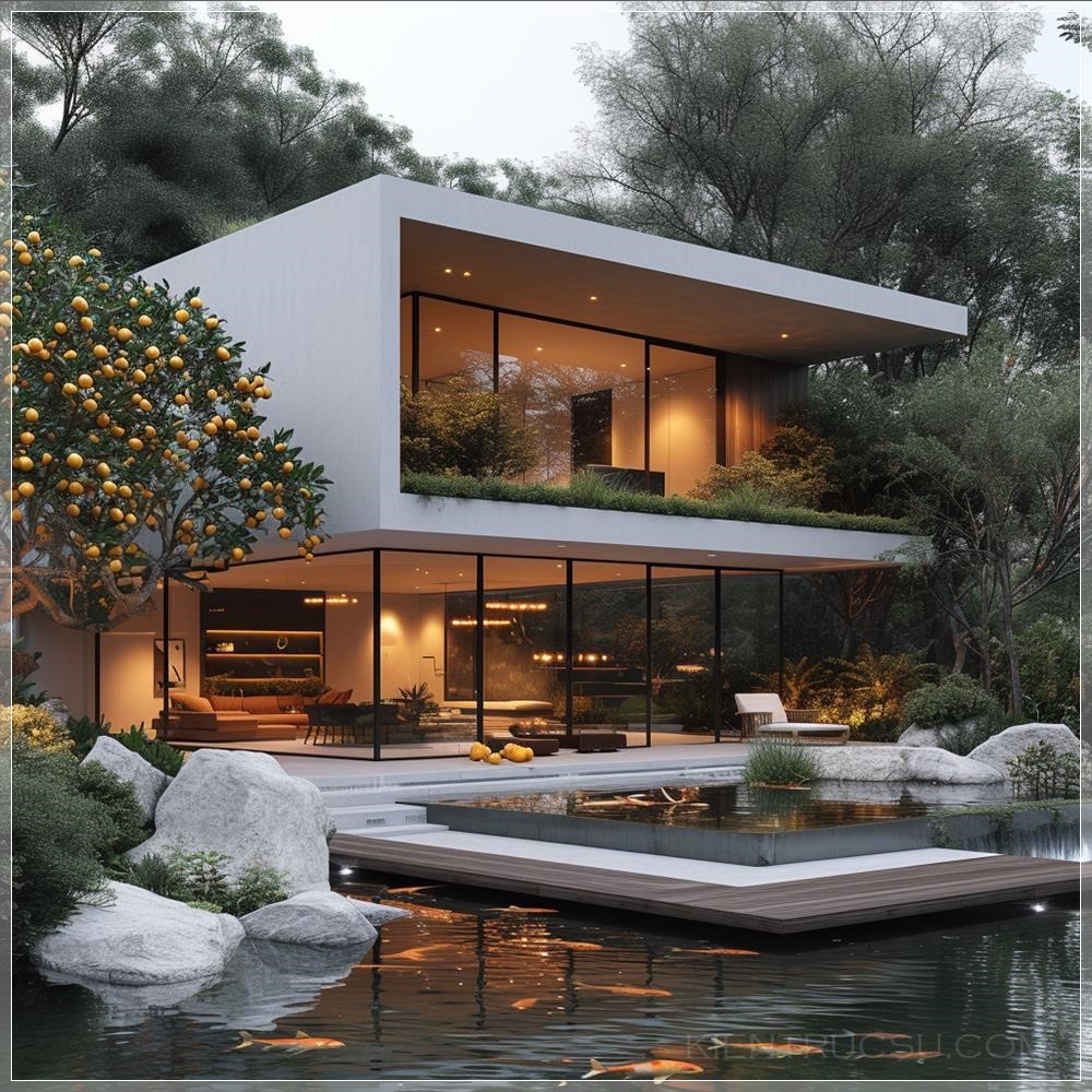 Step into your sleek, white dream house on the forest's edge. Expansive windows connect the modern architecture with nature. A well-designed driveway leads to the property. In the garden, a majestic lemon tree overlooks a small pond with Koi fish. Capture the essence with a slightly elevated camera angle, highlighting the house, lemon tree, and driveway. --s 750 --v 6.0